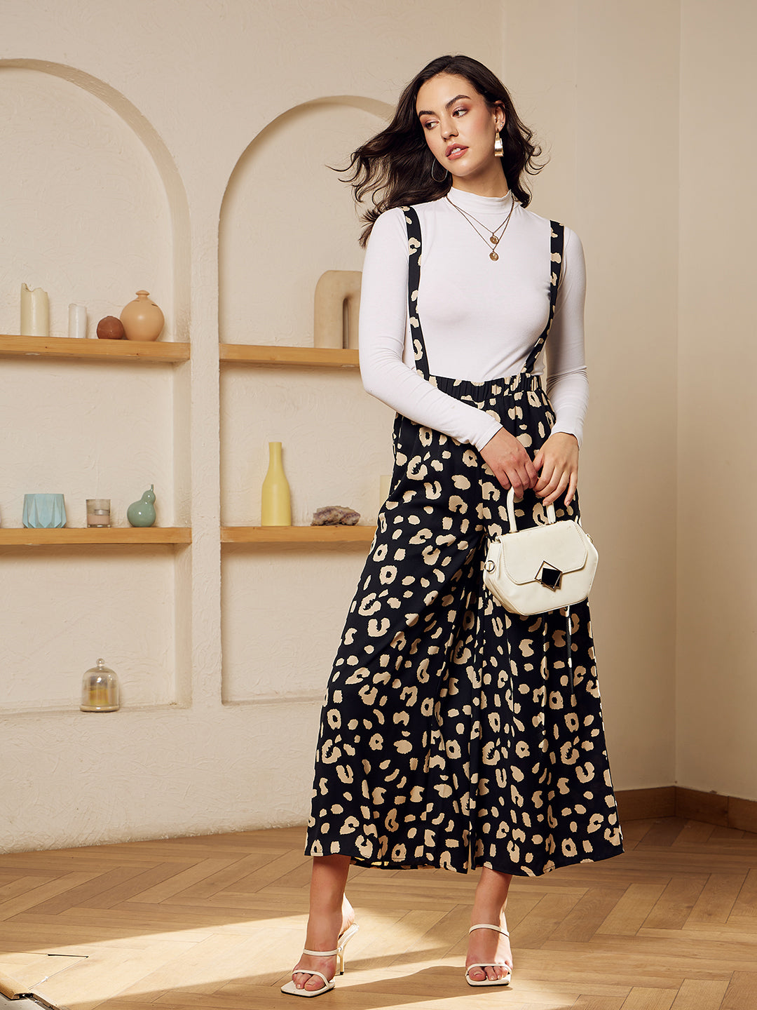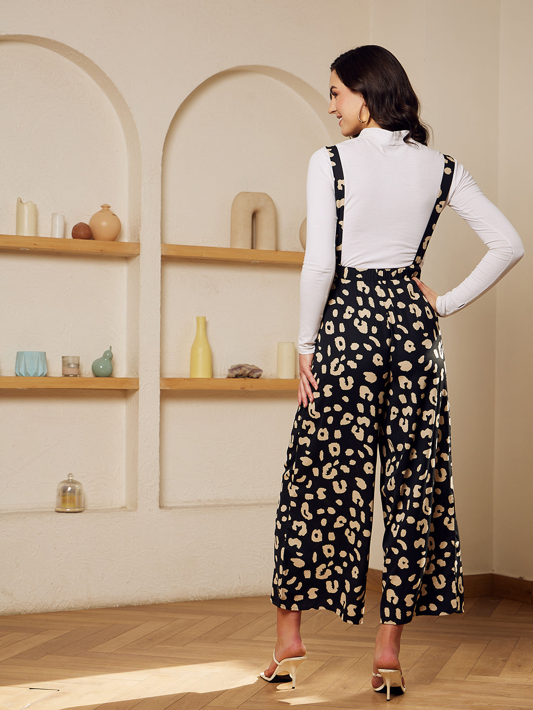 Opt for a transitional styling outfit for your casual meetups just like this charming Black & Beige Animal Print Sleeveless Elastic Waist Wide-Leg Crepe Midi Jumpsuit presented by Berrylush. The majestic duo of black shade and beige animal print gives this jumpsuit a charismatic design and lends you a striking look. This jumpsuit comes with a sleeveless design that offers a simple yet classy appeal. Also, detailed with shoulder straps that give your neckline a modest style that adds sophistication to your look. Step in and out with a fashion-flattering appearance by wearing this jumpsuit with a pair of block heels, a long-sleeve shirt, and a stylish handbag.