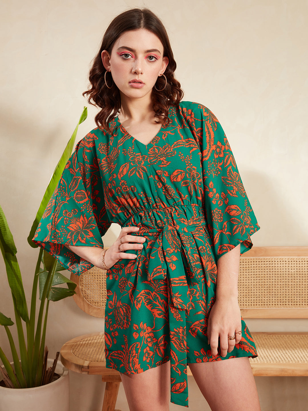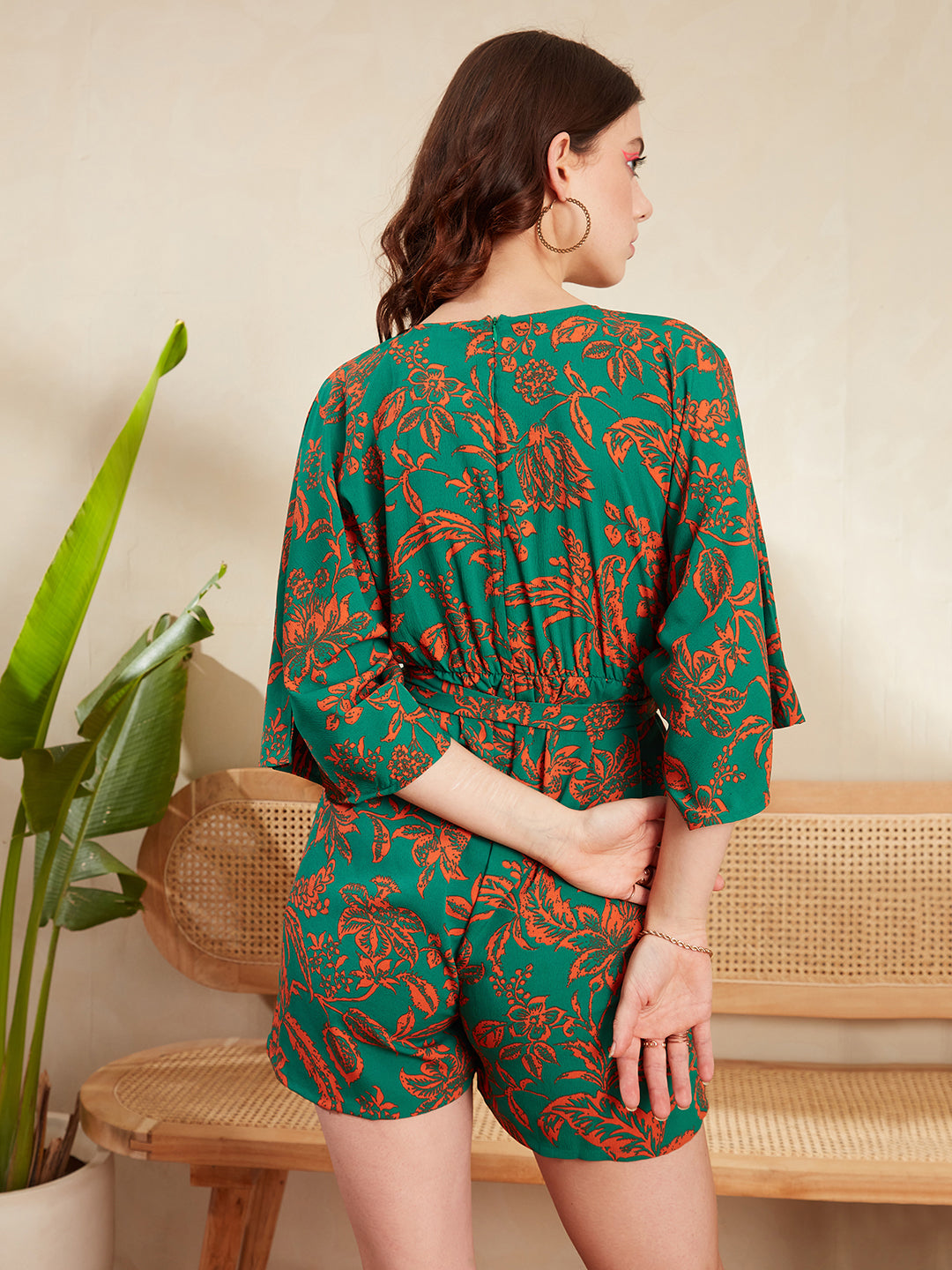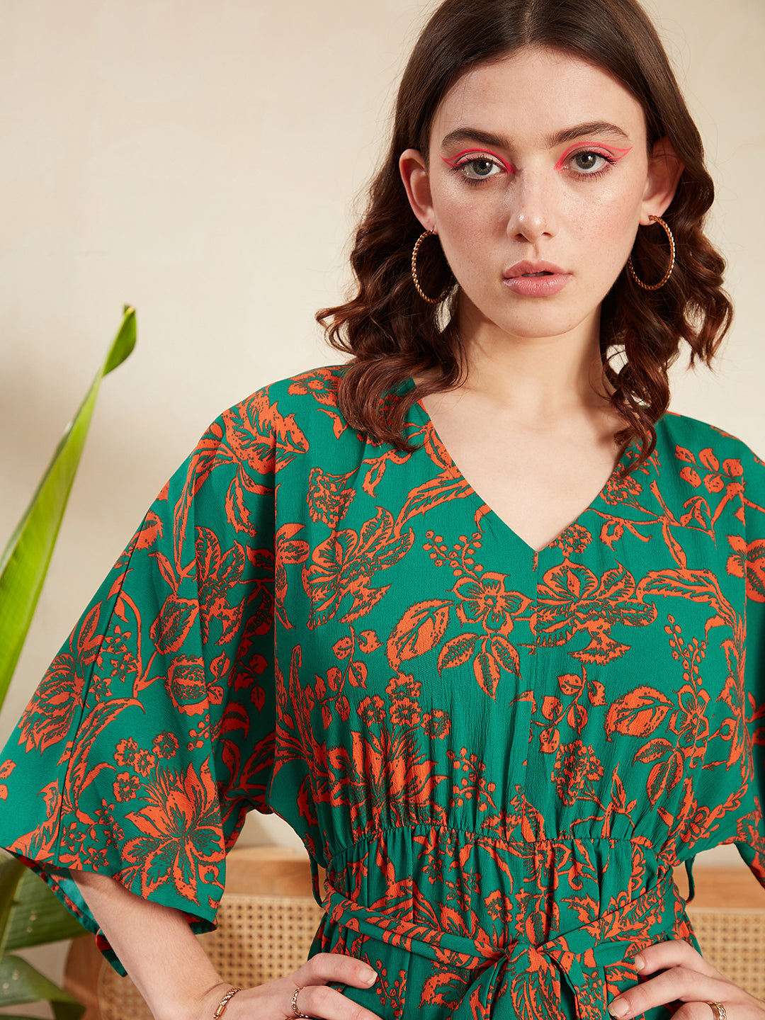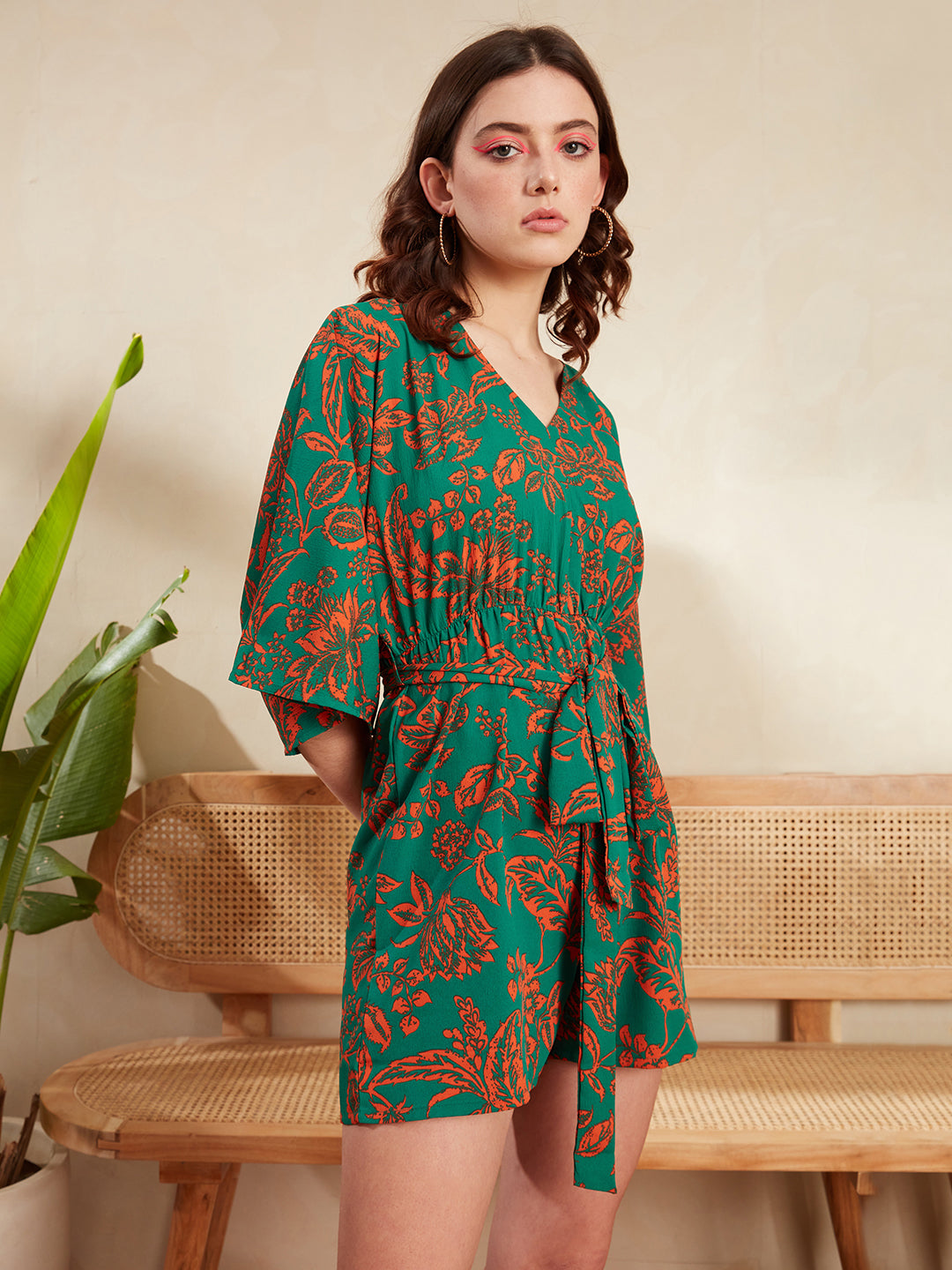 Berrylush Women Green & Orange Floral Printed V-Neck Batwing Sleeve Tie-Up Waist Pleated Mini Jumpsuit