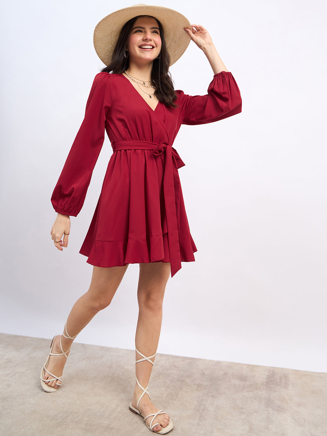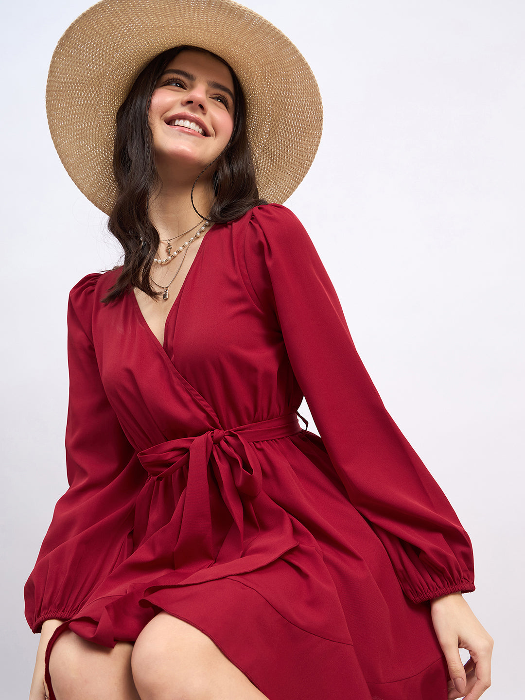 Berrylush Women Solid Red V-Neck Bishop Sleeves Tie-Up Waist Wrap Ruffled Mini Jumpsuit