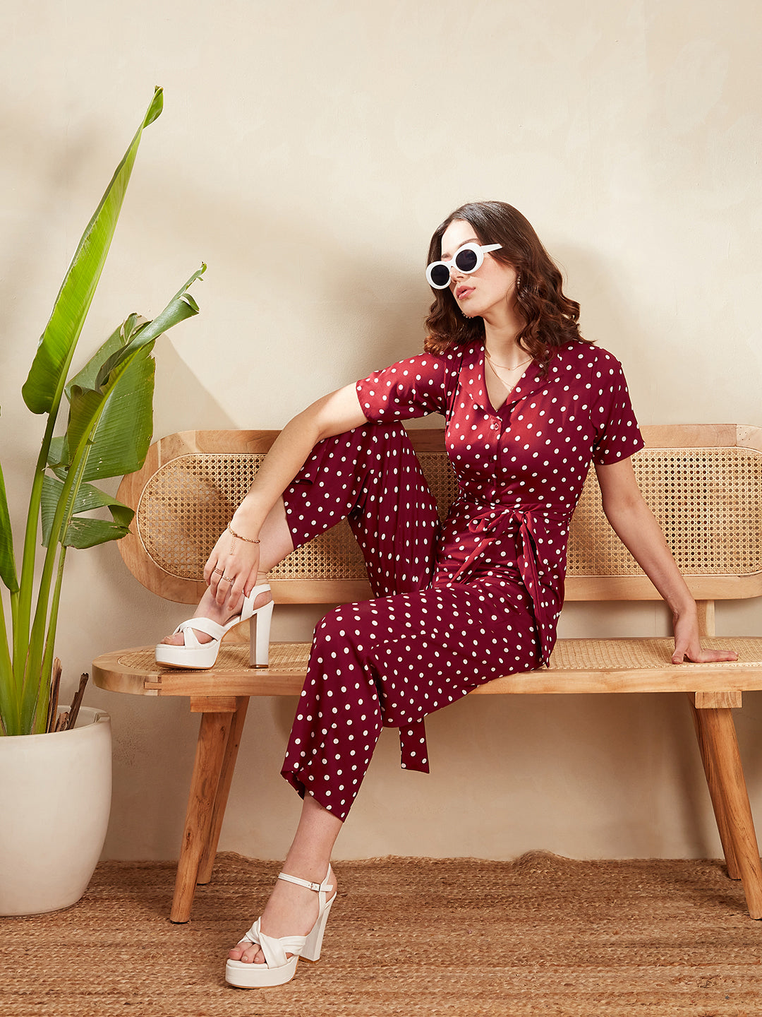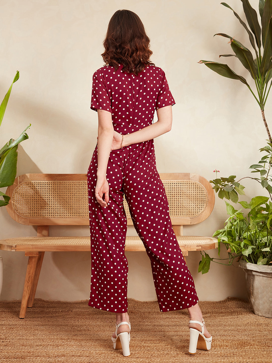 Berrylush Women Red & White Polka Dot Printed Notched Collar Neck Waist Tie-Up Maxi Jumpsuit