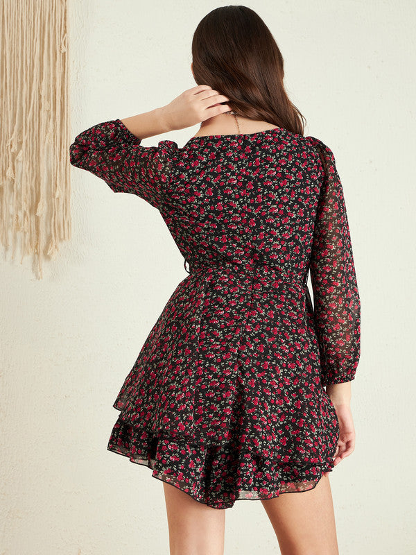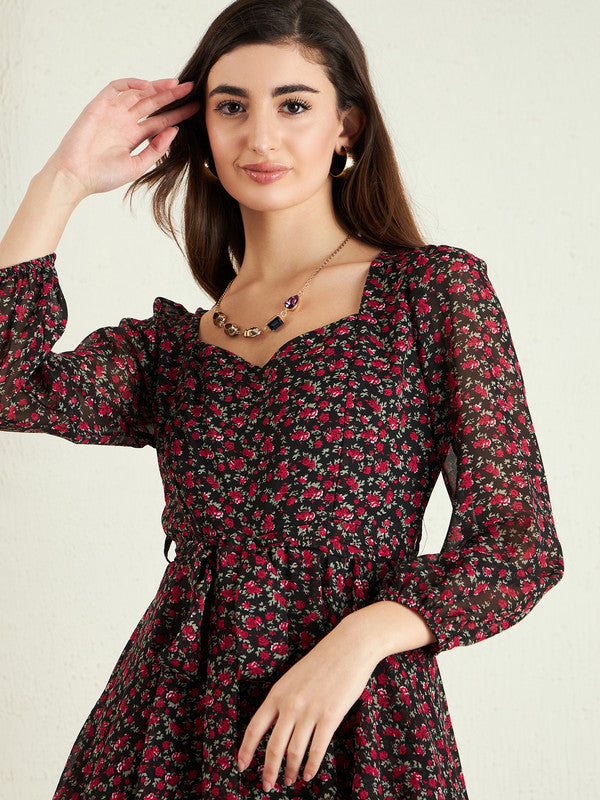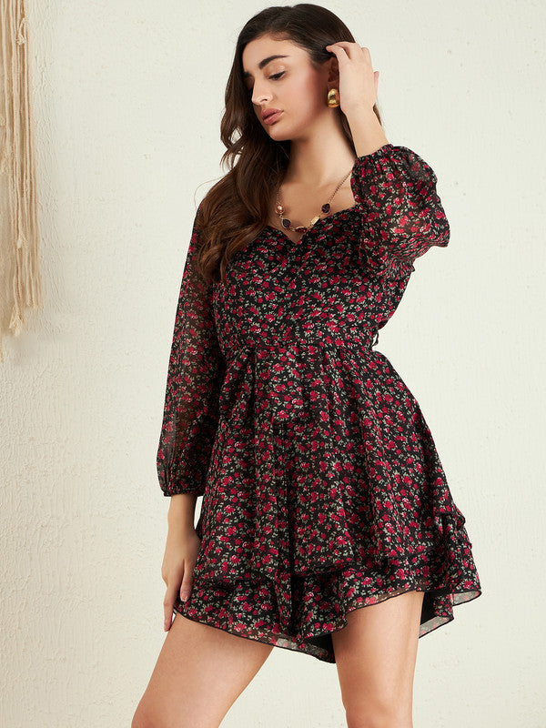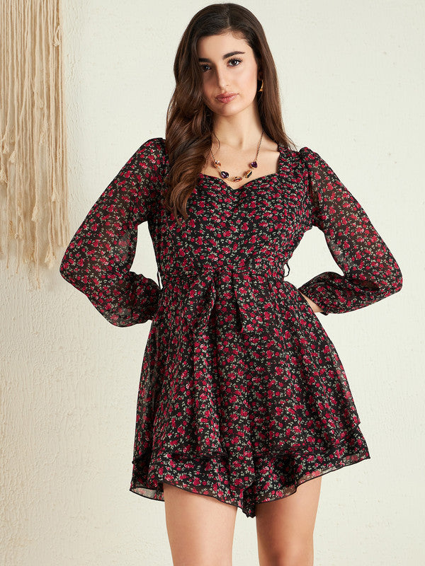 Berrylush Women Black & Red Floral Printed Sweetheart Neck Puff Sleeves Tie-Up Waist Layered Mini Jumpsuit