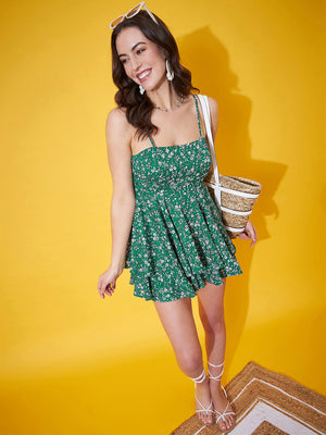Berrylush Women Green & White Floral Printed V-Neck Sleeveless Back Tie-Up Cutout Layered Mini Jumpsuit