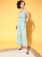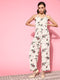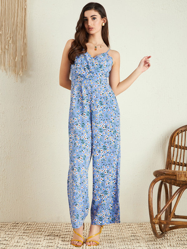 Berrylush Women Blue & White Floral Printed V-Neck Sleeveless Back Zipper Gathered Wrap Maxi Jumpsuit