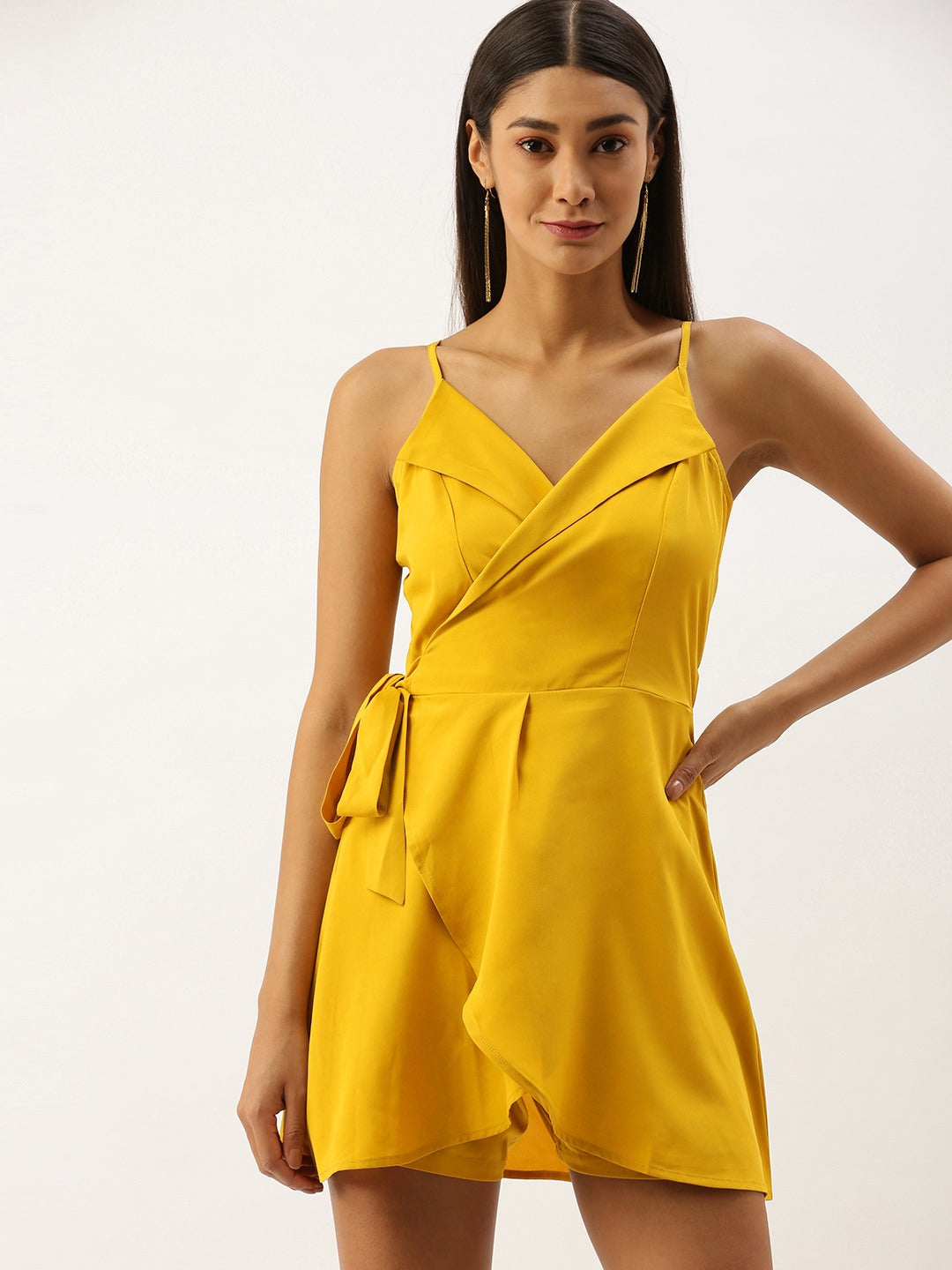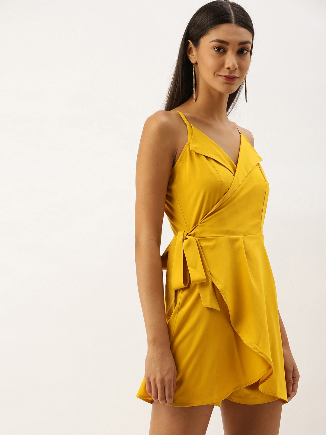 Imagined yourself into the coolest ever casual wear? If not then start to fantasize about your casual look then this Solid Yellow Ruffle Side Knot Cami Wrap Jumpsuit from Berrylush is a correct choice. A high-end finish of the ruffled lapels over the V-neckline fill your torso with iconic vogue. Play different with this cami jumpsuit that creates a unique style element with its ruffle design at the hemline. To bring a faddish outline the waistline gets a fabulous side knot element. To get the ultimate flirty essence, pair this cute jumpsuit with strappy heels, a trendy sling bag and some dazzling jewellery to bring out your extravaganza look. Hence smile with your playful jumpsuit from Berrylush.