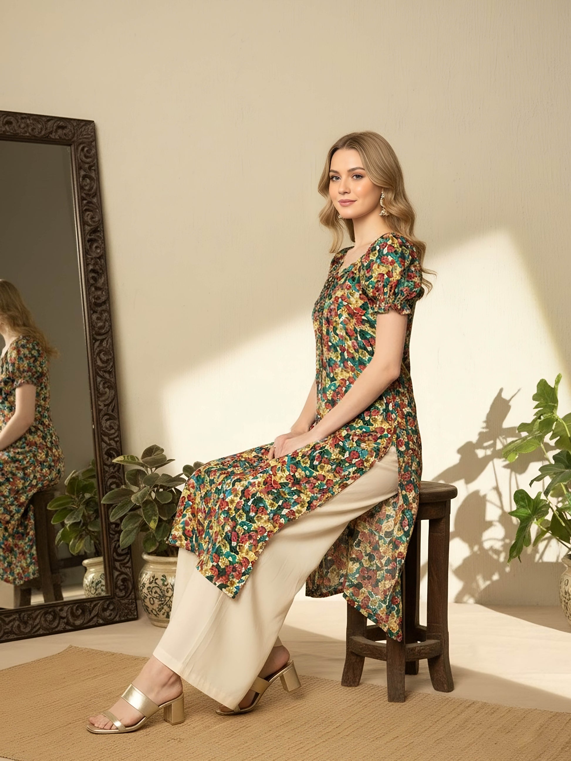 Brighten up your everyday style with the captivating Red, Green, & Yellow Floral Printed Kurta from Berrylush. This stunning piece showcases a delightful sweetheart neckline and charming puff sleeves that effortlessly blend comfort with femininity. Crafted from high-quality polyester and woven for a luxurious feel, it promises both durability and breathability. The eye-catching floral print bursts with vibrant colours, while the calf-length hem complements any casual occasion - from brunch dates to relaxed outings. A unique tie-up closure adds an element of playfulness while enhancing the fitted silhouette you crave. The thoughtfully designed side slits provide ease of movement without compromising elegance. Step into effortless chicness as this opaque kurta takes centre stage in your wardrobe - perfectly paired with leggings or jeans for endless styling options! Treat yourself to this essential piece today - it's not just clothing; it's an expression of who you are!