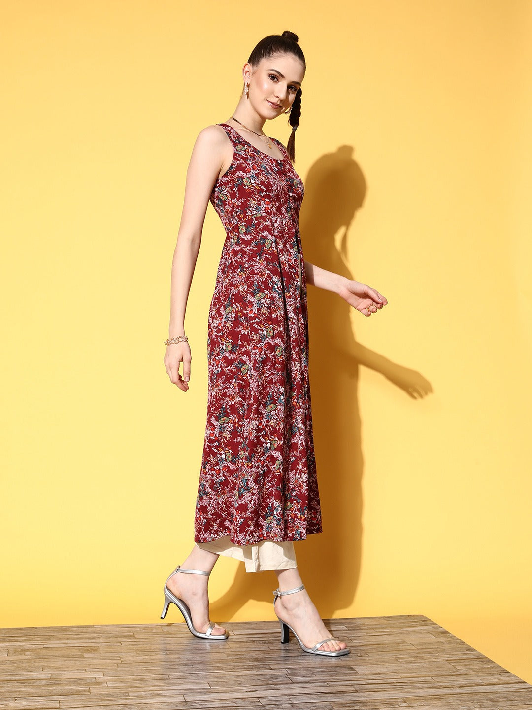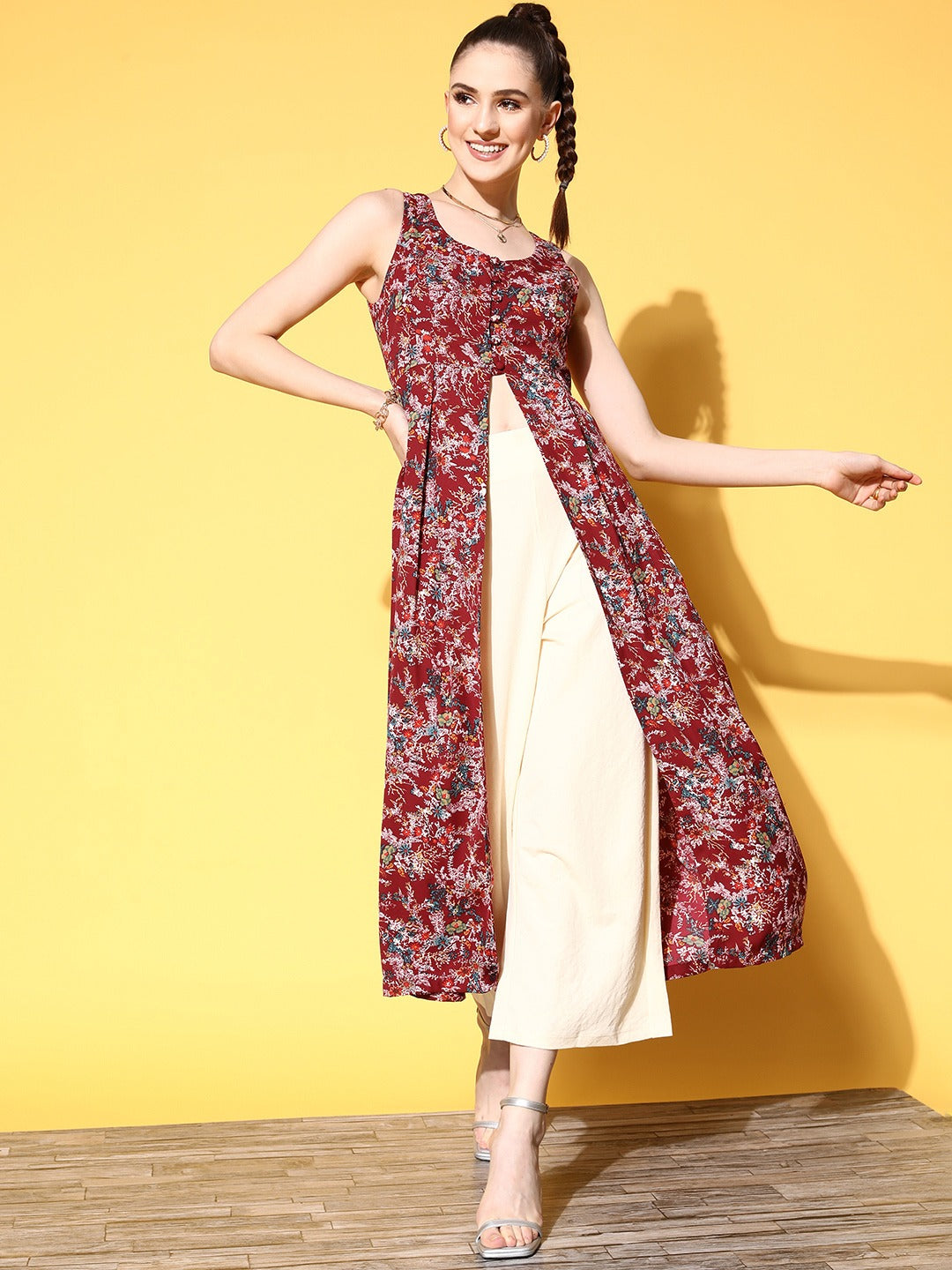 Give a stylish and traditional change to your day-to-day wardrobe with beautiful shades and drop-dead styles just like this mesmerizing Maroon Floral Printed Round Neck Front Slit Flared A-Line Calf Length Kurta designed by Berrylush. Elegantly fashioned with a flared hemline that injects volume and flowy structure to this kurta along with a bouncy drape that makes your look noticeable more than ever. Styled with a round neck design that gives your neckline a sophisticated appeal and makes this kurta appear modest. Comes with a regular weave pattern and machine weave detailing that enhances the structural silhouette and integrity of this kurta. Wear this A-line kurta over parallel pants or palazzos, a pair of block heels, hoop earrings, and a cute clutch to create a stunning look for every occasion.