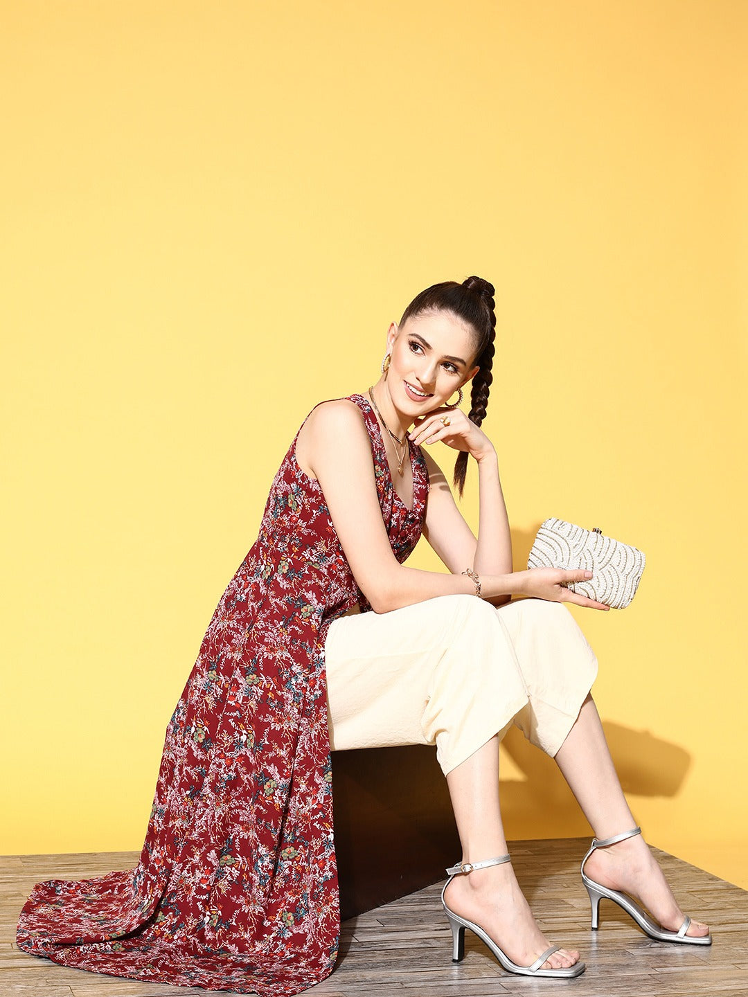 - The maroon shade with floral print gives away a tropical and luxurious vibe
