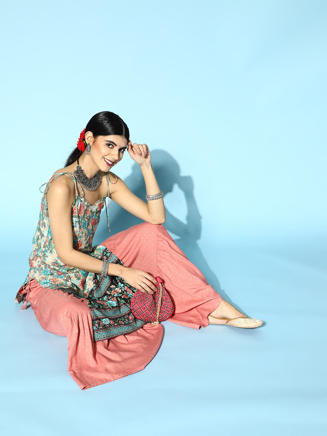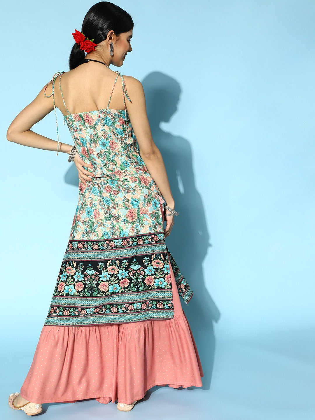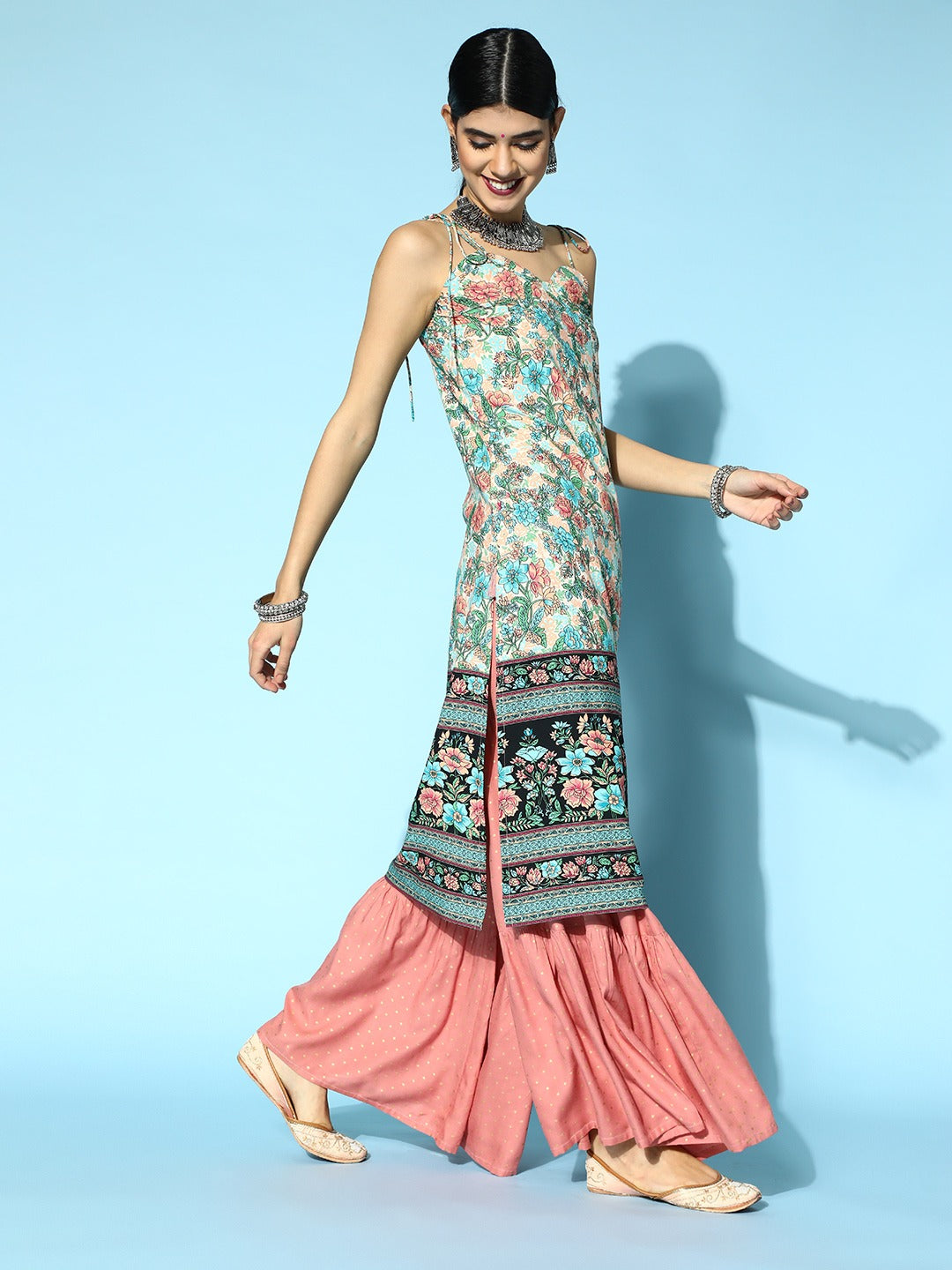 Berrylush Women Peach & Green Floral Printed Sweetheart Neck Tie-Up Strap Straight Midi Kurta