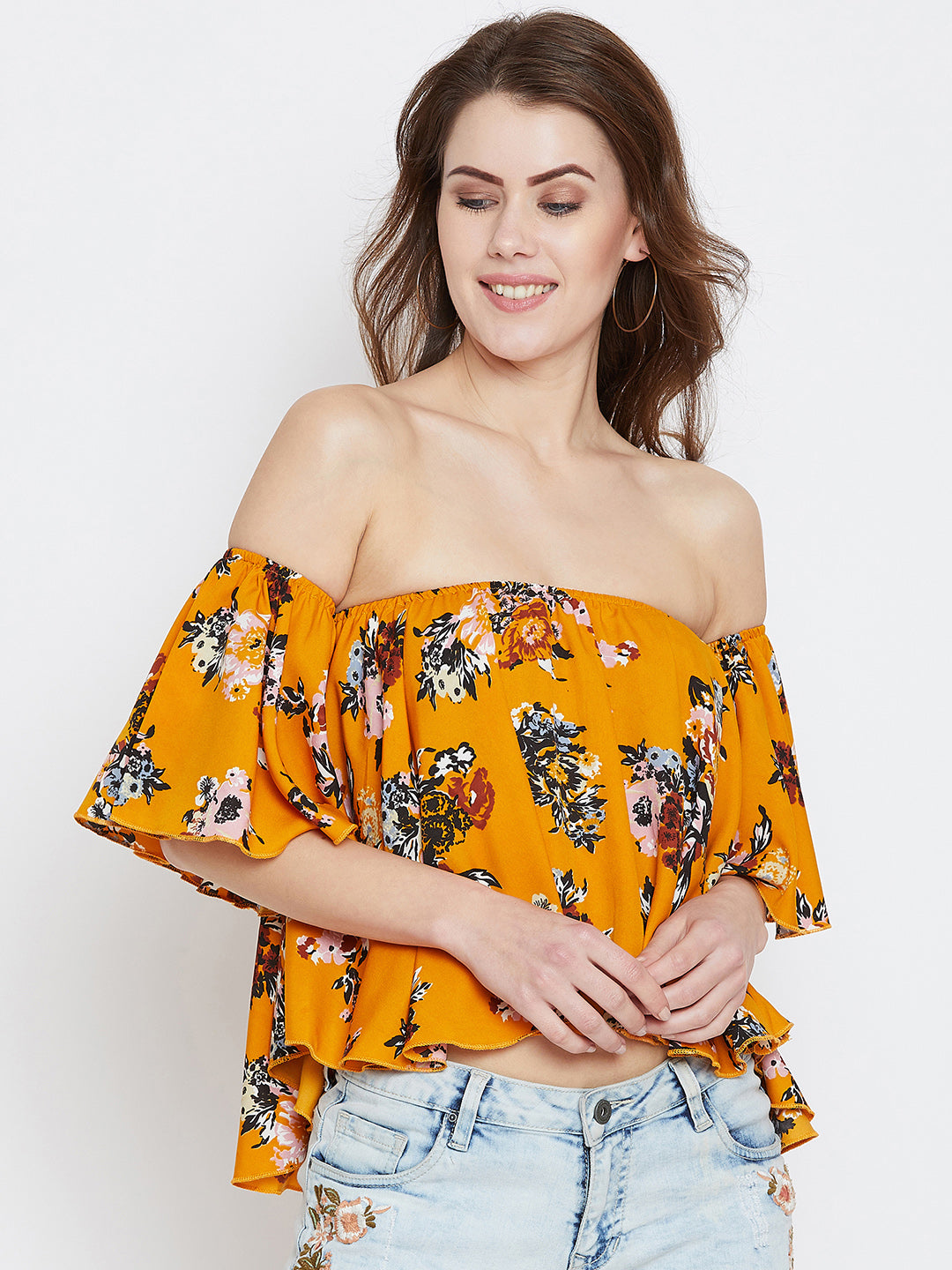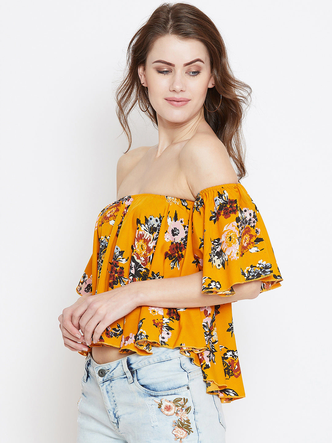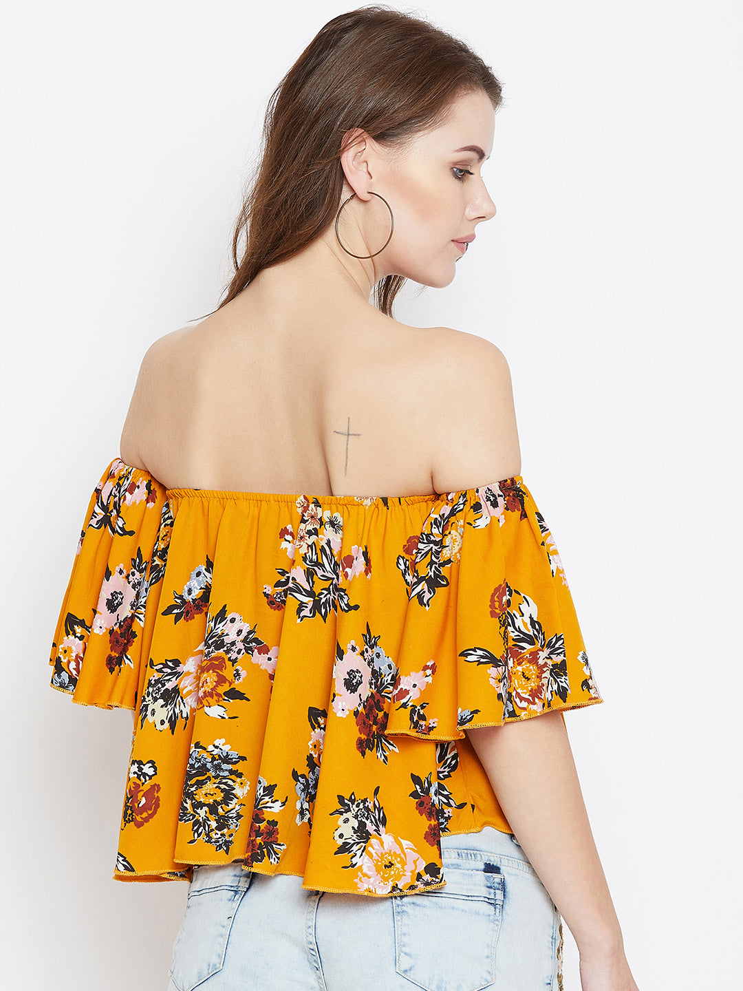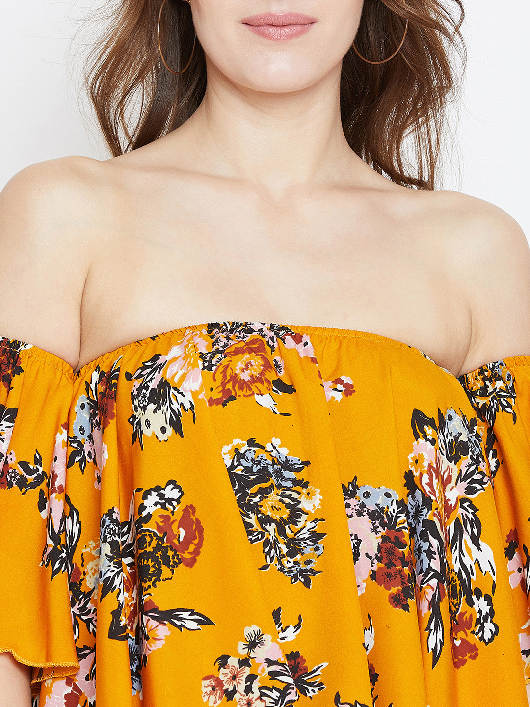 Berrylush Women Mustard & Green Floral Printed Off-Shoulder Neck Ruffled Crop Bardot Top