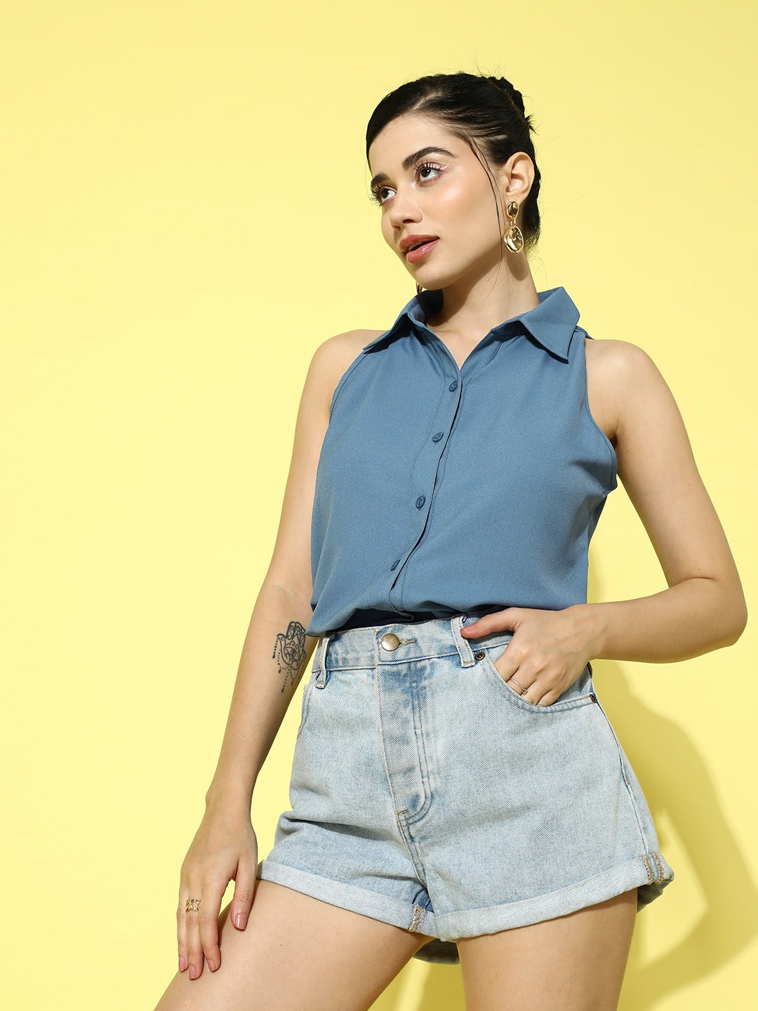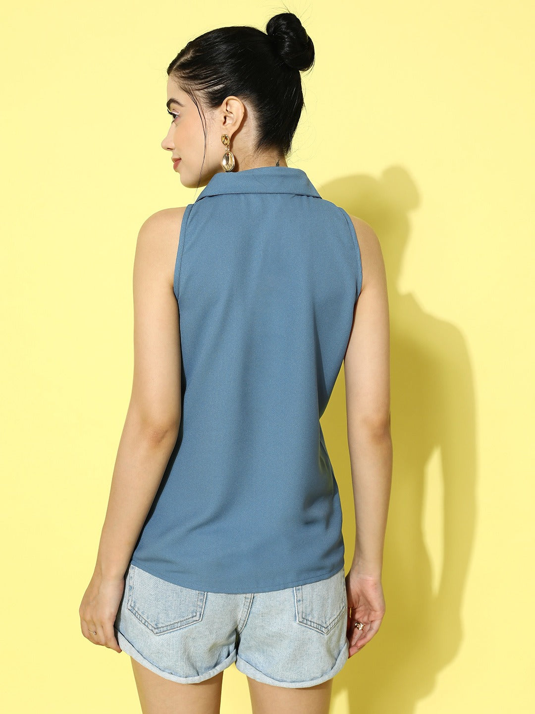 Berrylush Women Solid Blue Spread Collar Neck Sleeveless Button-Up Straight Hem Casual Shirt