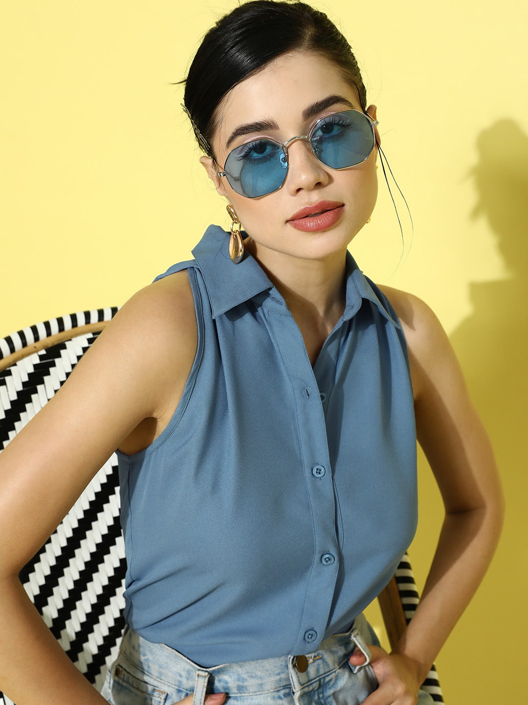 Inject a free-spirited and professional ascent to your capsule closet with this majestic Solid Blue Spread Collar Neck Sleeveless Button-Up Straight Hem Casual Shirt designed by Berrylush. The most admired element of this shirt is the amusing amalgam of blue shade with the solid pattern which depicts your passionate personality with a classy appearance. The spread collar neckline of the shirt gives a formal highlight to your neck with a refined sheen while the straight hemline presents a fascinating style. Complete the look by pairing this astonishing casual shirt with a pair of parallel trousers, hoop earrings, and strappy heels to create a mesmerizing look.