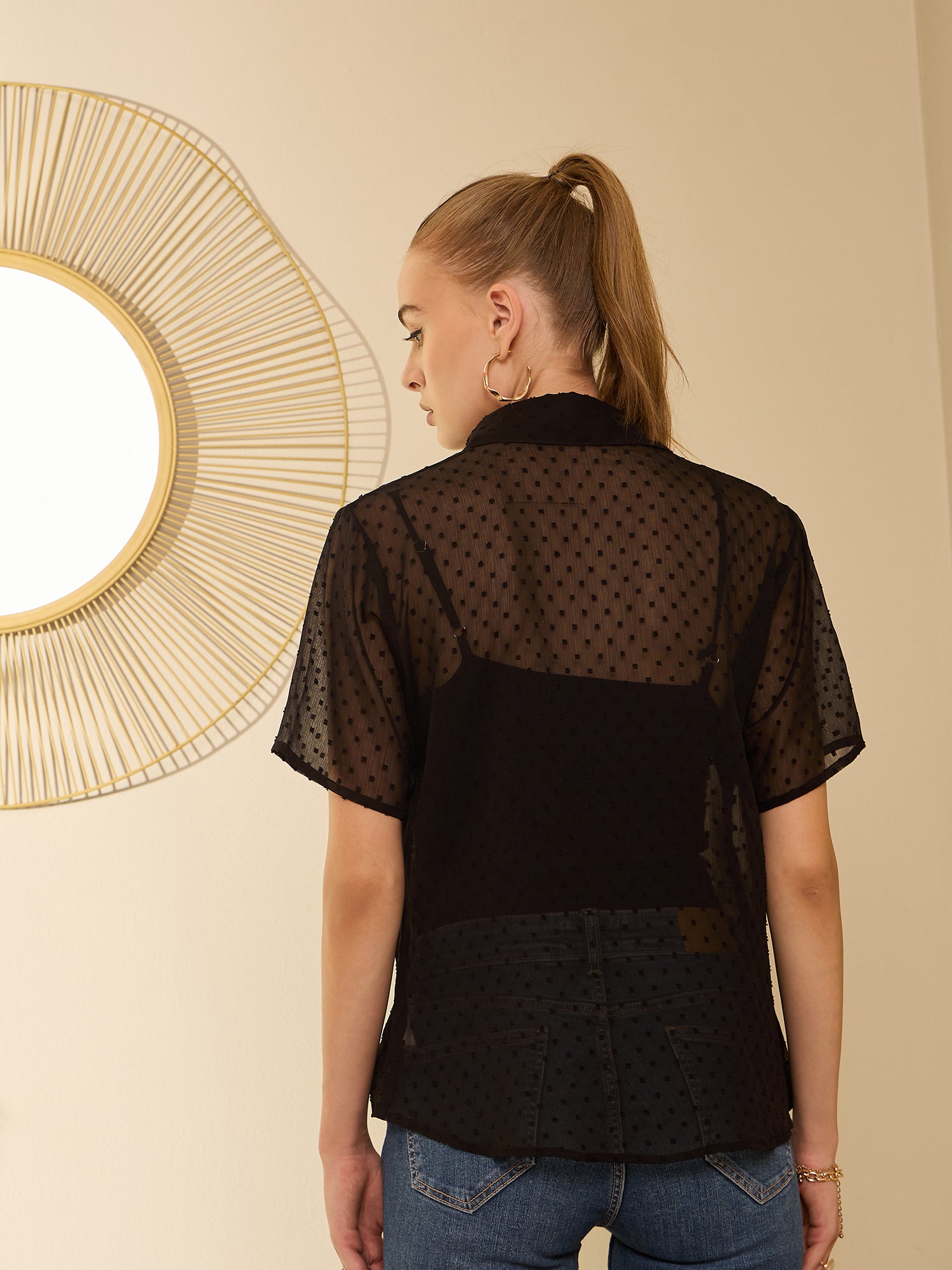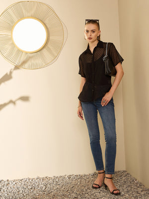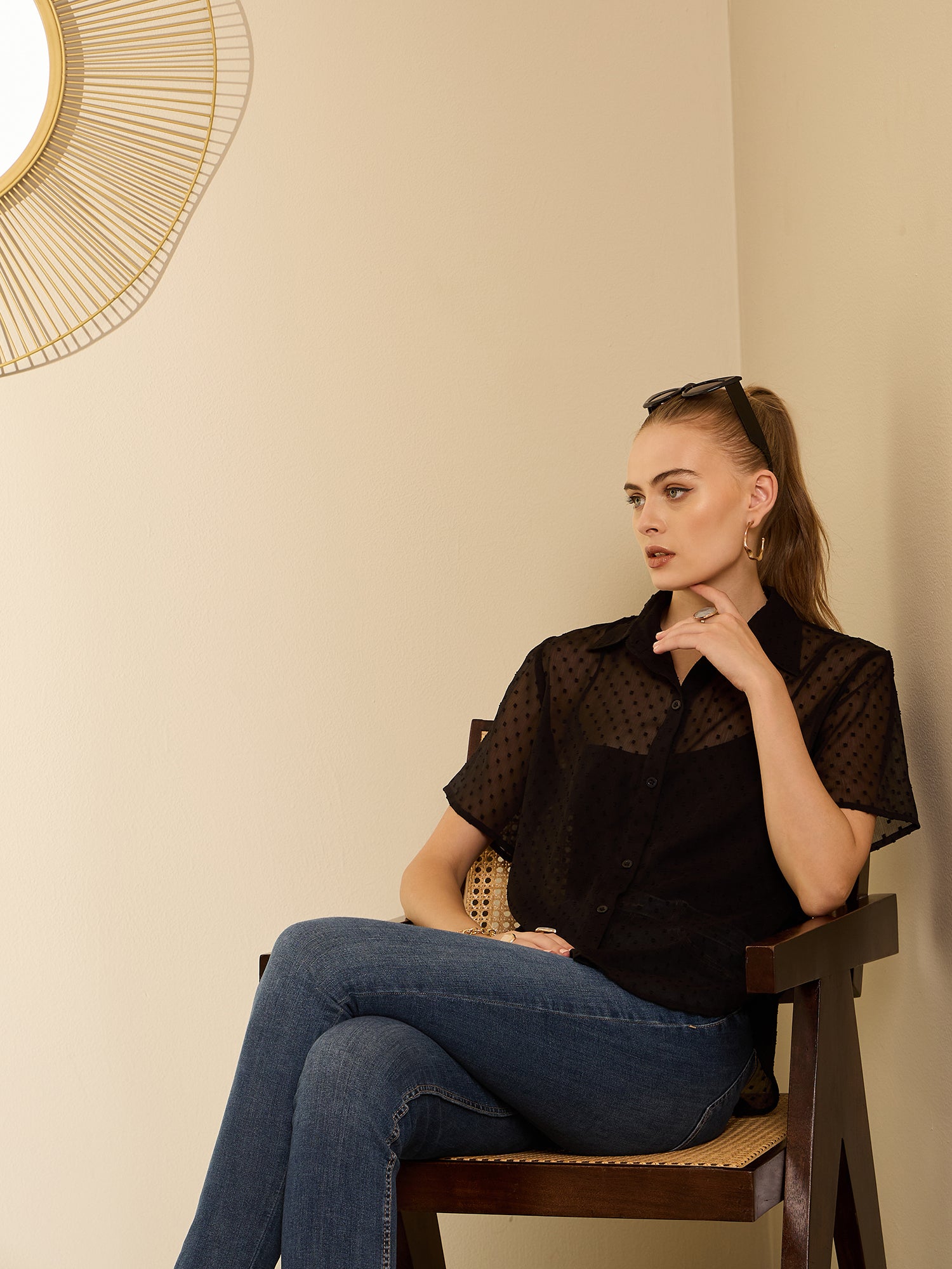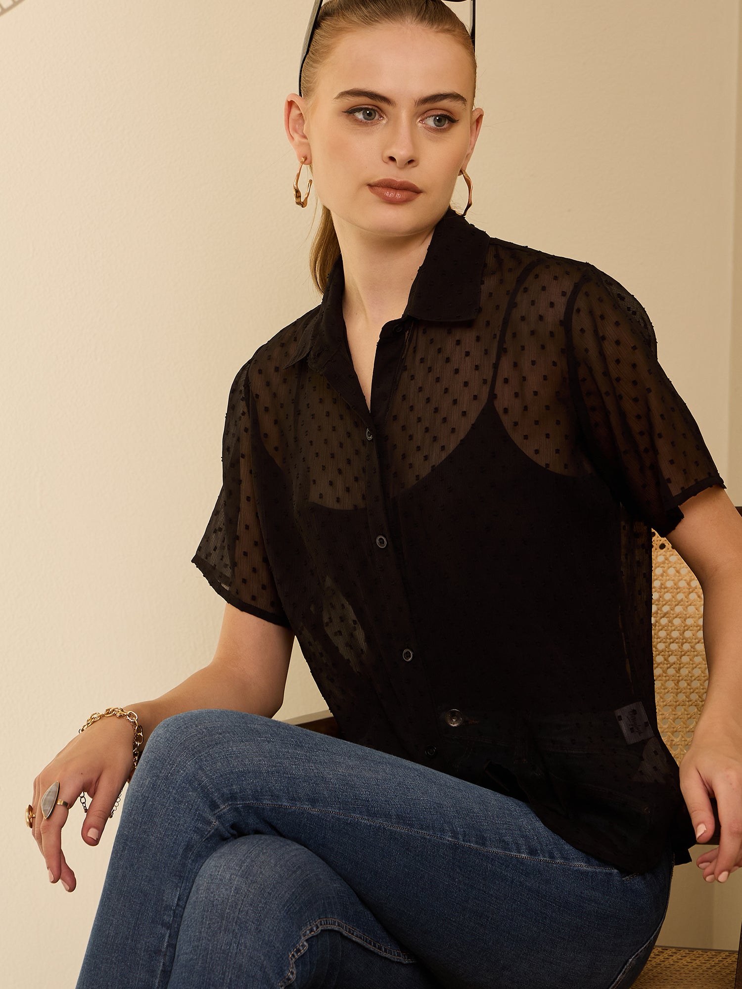Berrylush Women Solid Black Dobby Weave Spread Collar Neck Front Button-Up Straight Hem Semi-Sheer Regular Shirt