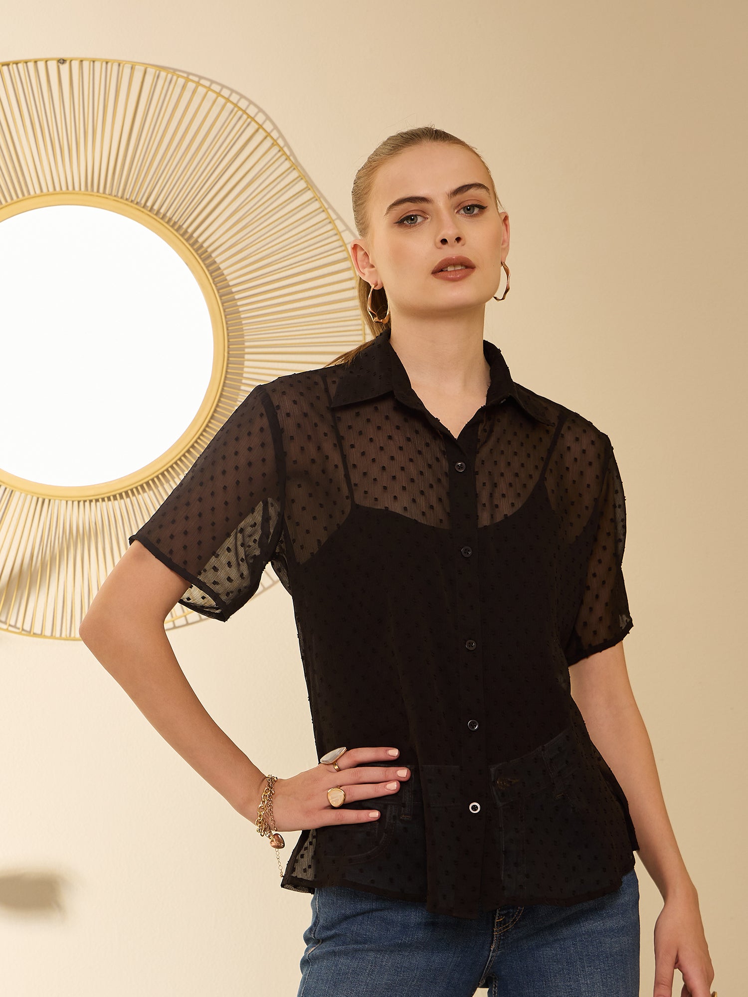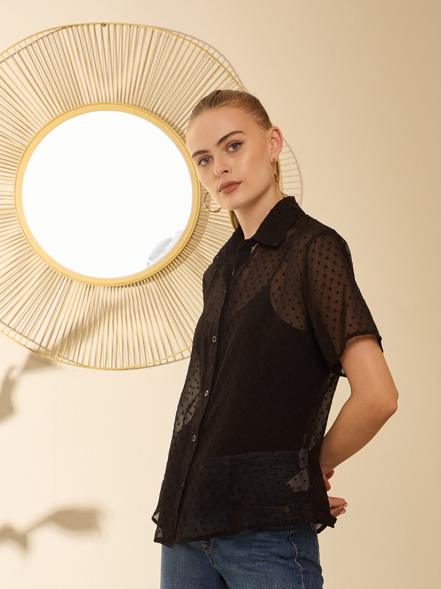 Step out in style with the stylishly versatile Berrylush Solid Black Dobby Weave Shirt. Perfect for casual occasions, this polyester-made shirt is tailored for comfort and durability. Characterized by its sleek spread collar, front button-up closure, and effortlessly chic semi-sheer finish that adds a touch of allure to your ensemble. The short sleeves give it a relaxed vibe while the straight hem ensures a clean silhouette suitable for any setting - day or night. Make an impression without saying a word in this must-have wardrobe staple designed to highlight your sense of fashion effortlessly.