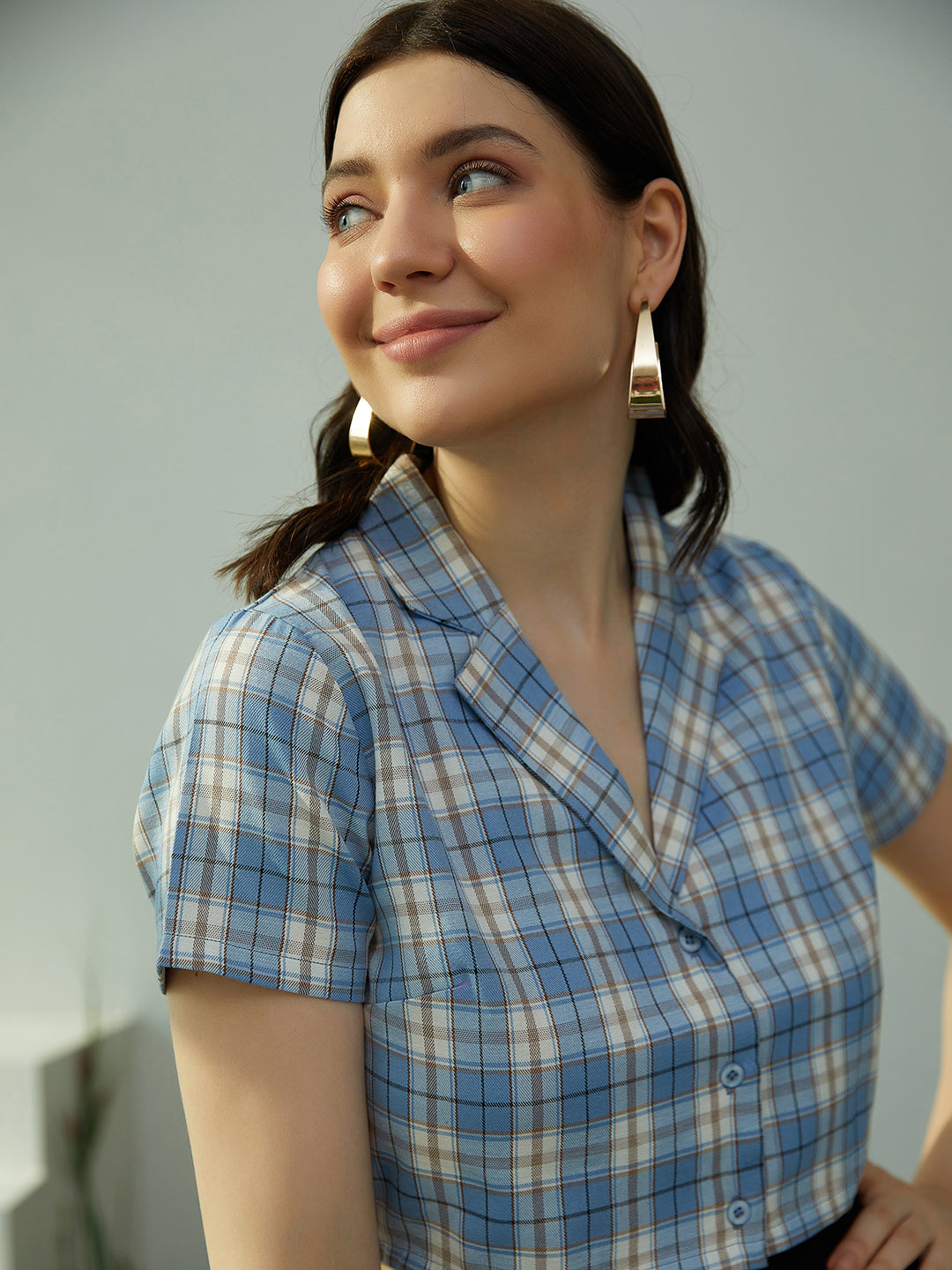 Gift your capsule closet the ideal zeal addition with a hint of sophistication by investing in this chic Checked Blue Spread Collar Button Front Crop Shirt introduced by Berrylush. Spun from the finest core polyester fabric that lends this shirt excellent elasticity with anti-wrinkles and anti-fading characteristics. Designed with a cropped length that makes this shirt appear trendy and exotic with an eccentric appeal to your feminine figure. The straight hemline gives this shirt a smart and seamless appearance with a strong horizontal structure. Walk out of your house looking glamorous by wearing this crop shirt with a black mini skirt, a pair of knee-high boots, matching earrings, and your favourite handbag.