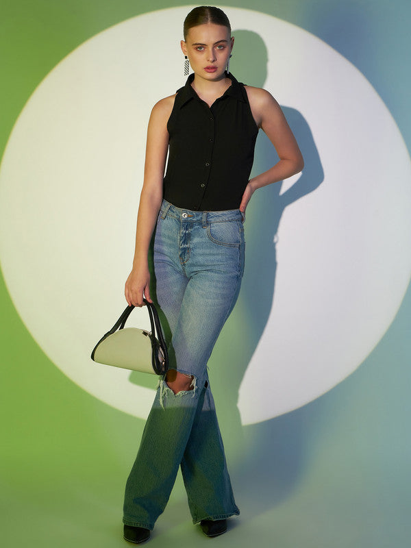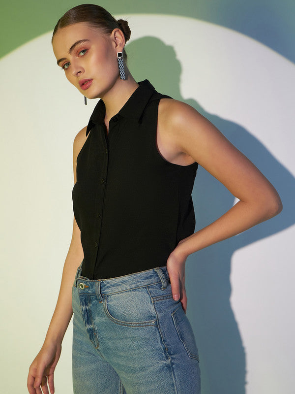 Berrylush Women Solid Black Spread Collar Neck Sleeveless Button-Up Curved Hem Regular Shirt