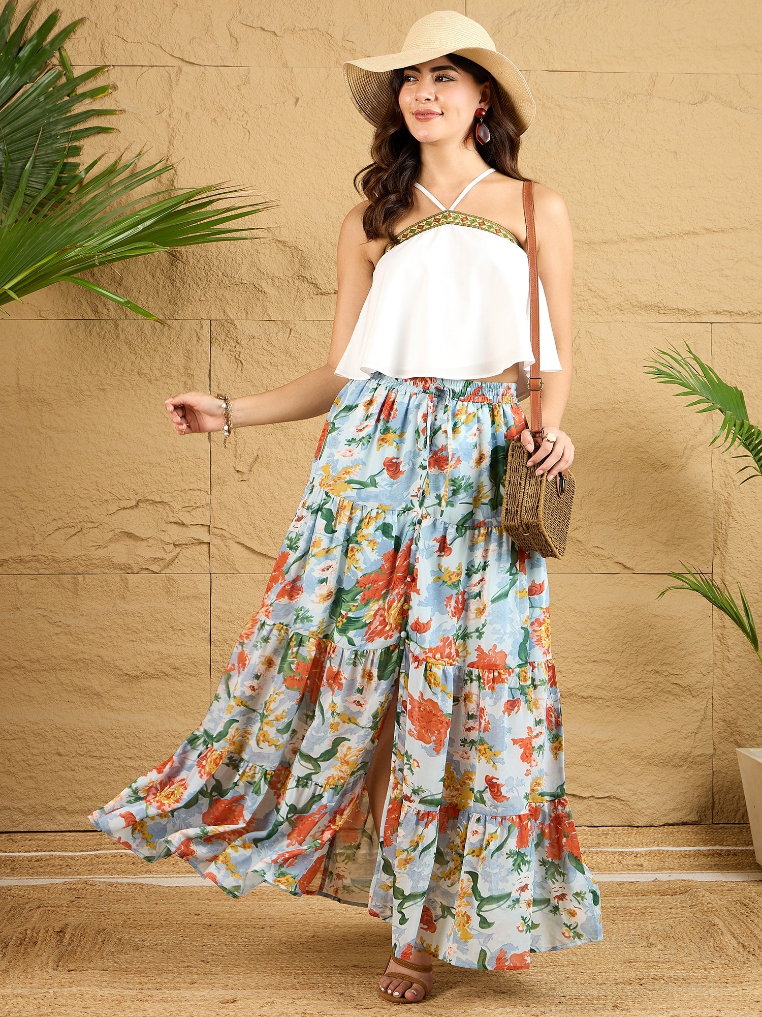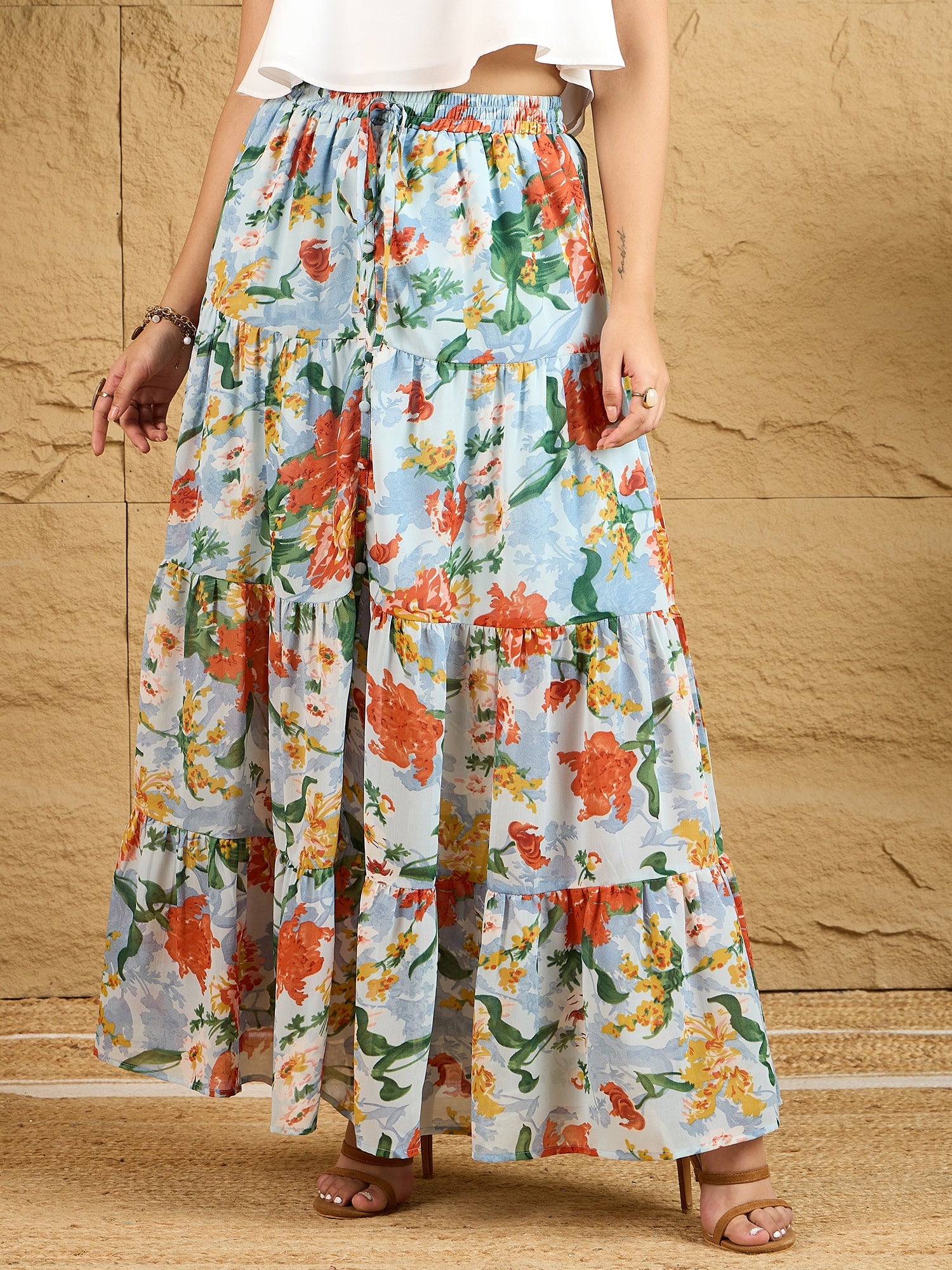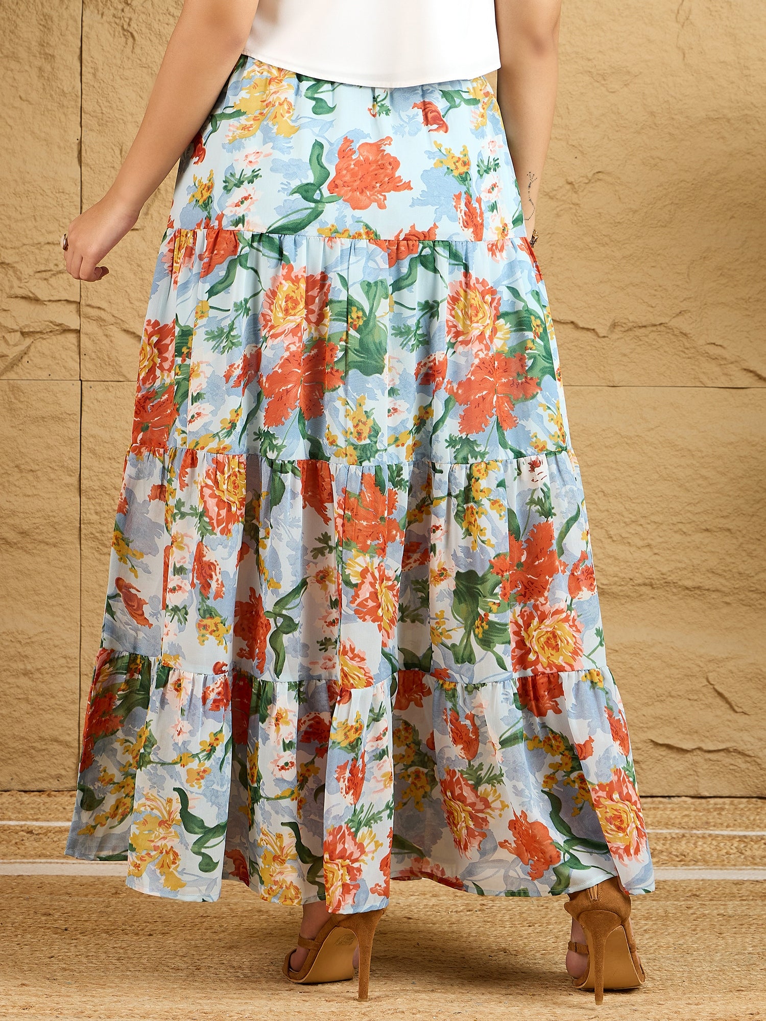 Introducing the Berrylush Blue & Orange Floral Printed Maxi Skirt, a mesmerizing blend of style and comfort that redefines your casual wear. Crafted from high-quality polyester with a woven texture, this A-line skirt showcases a vibrant floral print in striking shades of blue and orange. Its elastic waistband ensures an effortless fit at the high-rise waist, while the front thigh-high slit adds a hint of allure to its flowing silhouette. The gathered surface styling around the flared hemline enhances its elegance, making it perfect for day outings or relaxed evenings alike. Slip into this opaque masterpiece with ease and experience fashion that speaks to your soul.