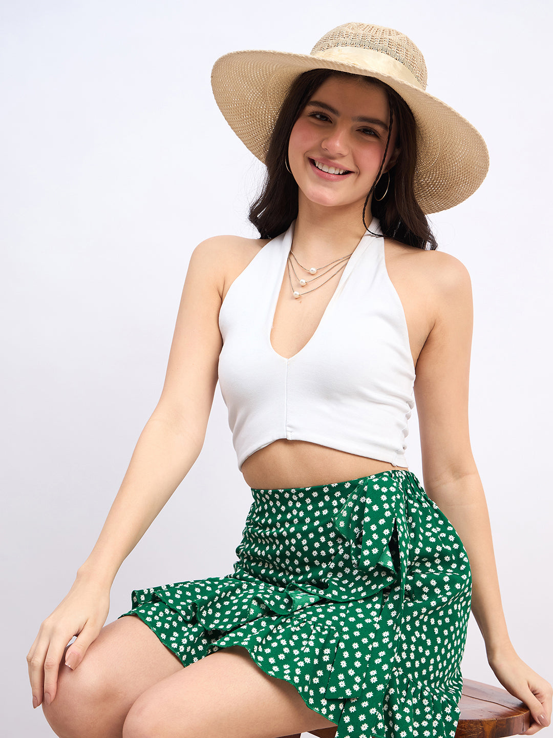 Berrylush Women Green & White Floral Printed High-Rise Waist Tie-Up Slip-On Wrap Pleated Mini Skirt