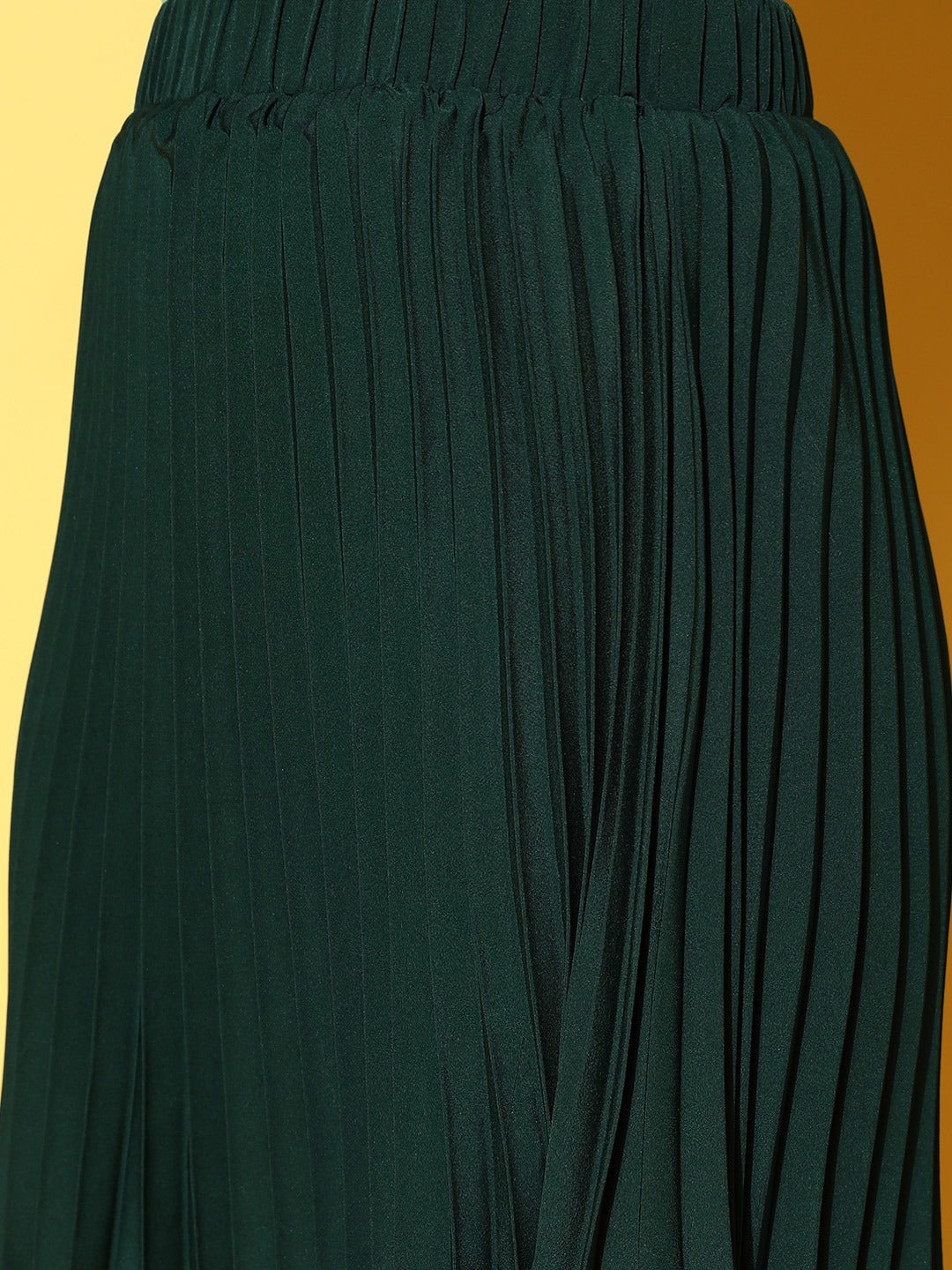 Berrylush Women Solid Green Elastic Waist Accordion Pleat Slip-On Flared Mini Skirt