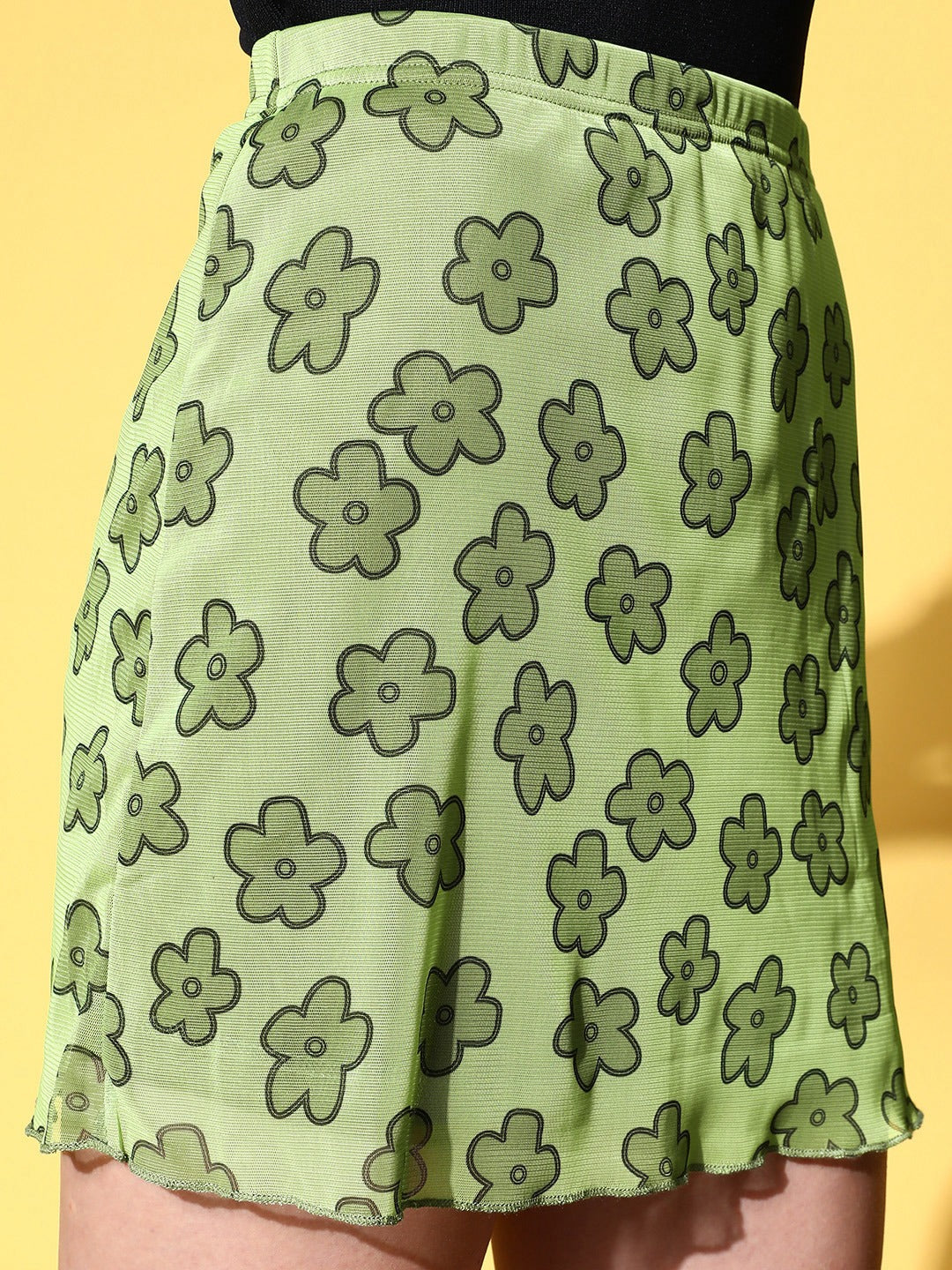 Berrylush Women Green & Black Floral Printed Straight Hem Slip-On A-Line Mini Skirt