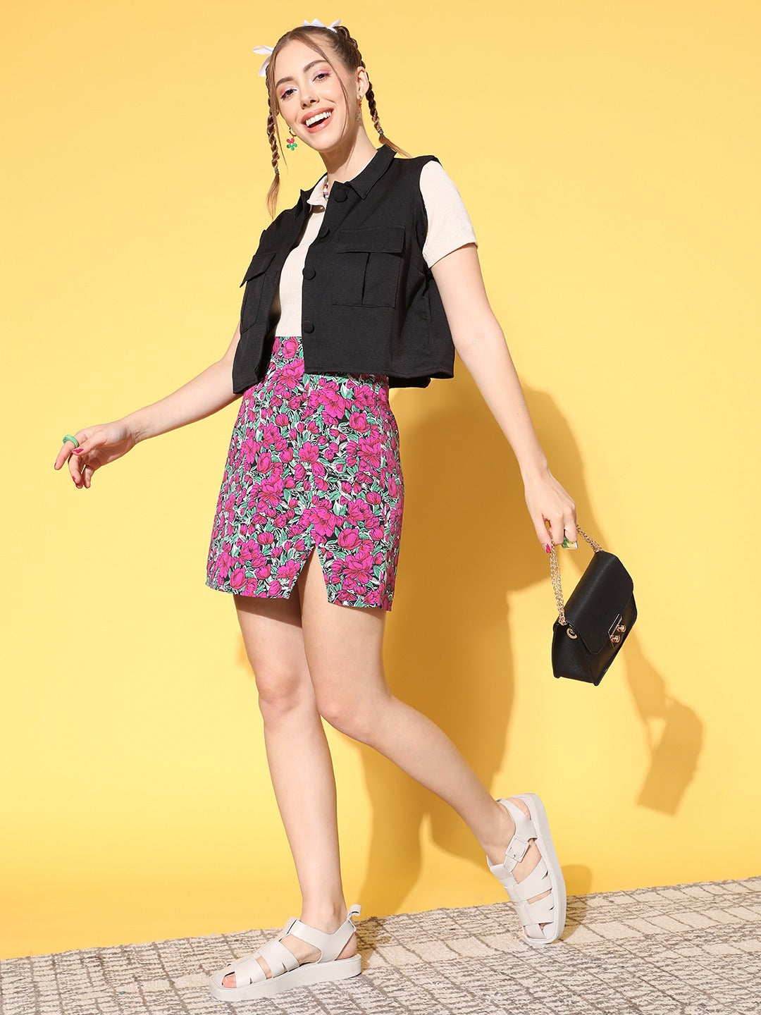 Berrylush Women Purple & Green Floral Printed Front Slit Straight A-Line Mini Skirt