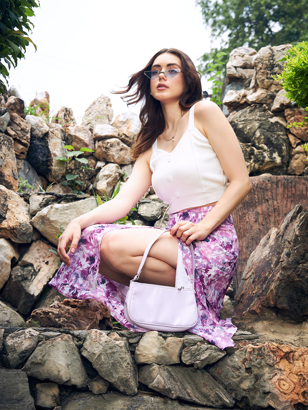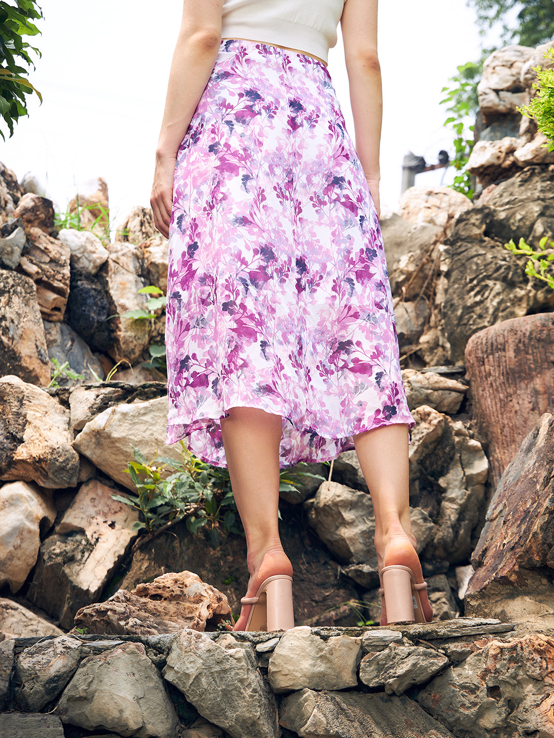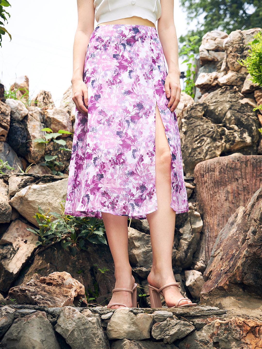 Berrylush Women White, Pink, & Purple Floral Printed Elastic Waist Georgette Straight Hem Thigh-High Slit A-Line Midi Skirt