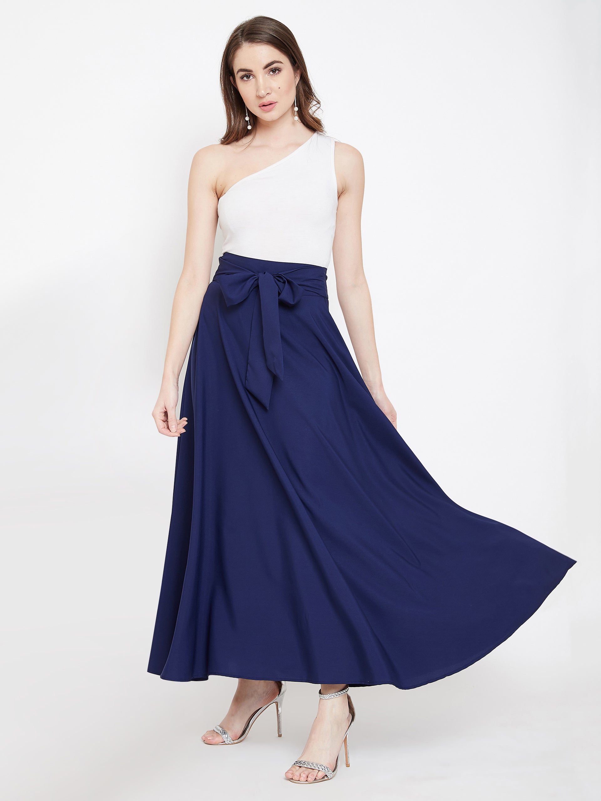 Berrylush Women Solid Navy Blue Bow-Tie High-Waist Flared Maxi Skirt