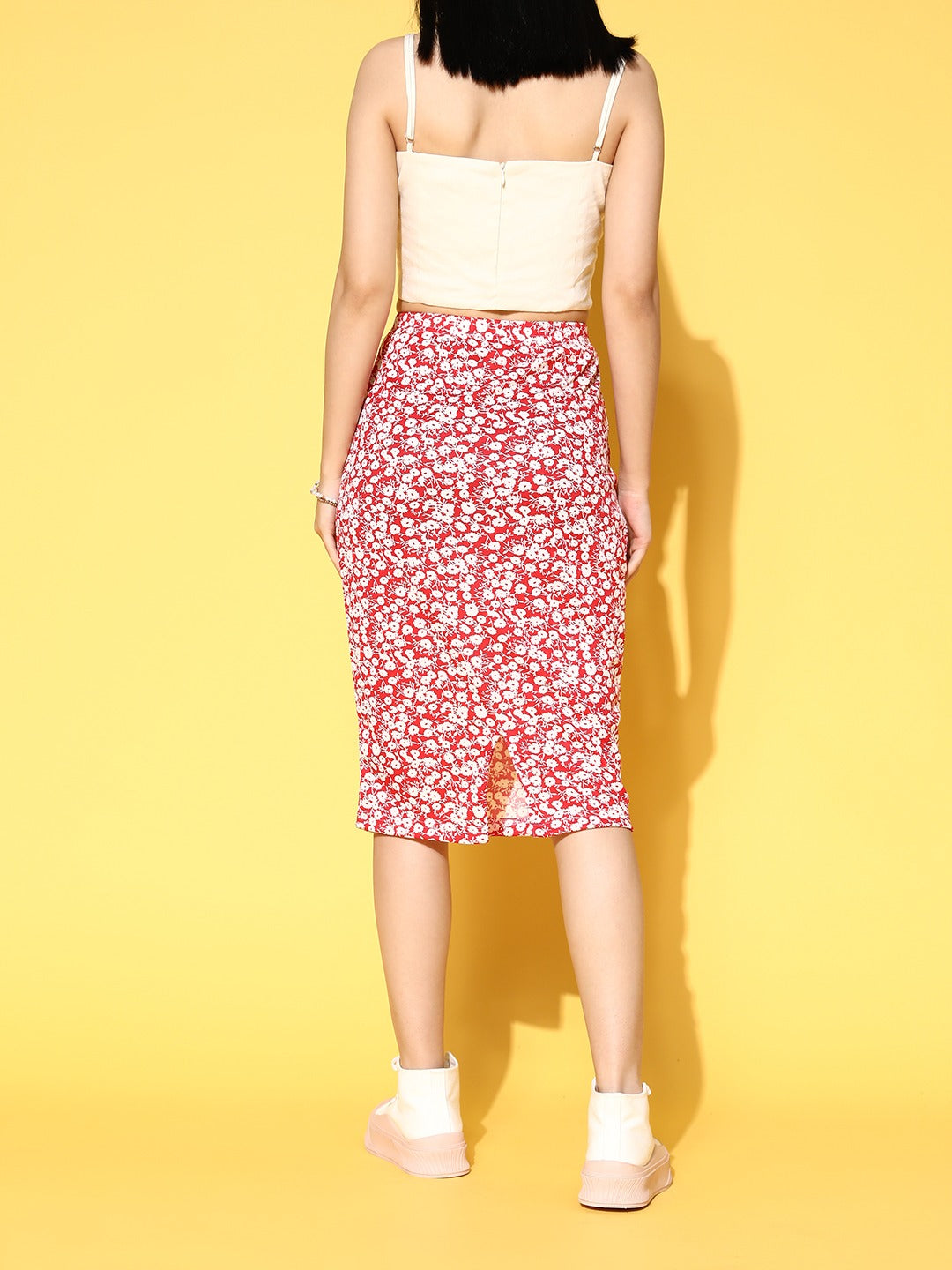 Channel a majestic amalgam of voguish and radiant style within your capsule wardrobe with this ravishing Red Floral Printed Straight Hem Pencil Midi Skirt from Berrylush. Punctuated from breathable crepe polyester fabric that makes this skirt is comfortable with excellent moisture-wicking properties. Decorated with a beautiful combination of red and white ditsy floral print that lends this skirt a tinge of tropical beauty with calming vibe. Moreover, the knitted detailing adjoins a hint of elasticity to this skirt with super soft touch against your skin. Partner up this midi skirt with a pretty crop top, a pair of block heels, floral hoop earrings, and a cute side bag to create a bewitching look.