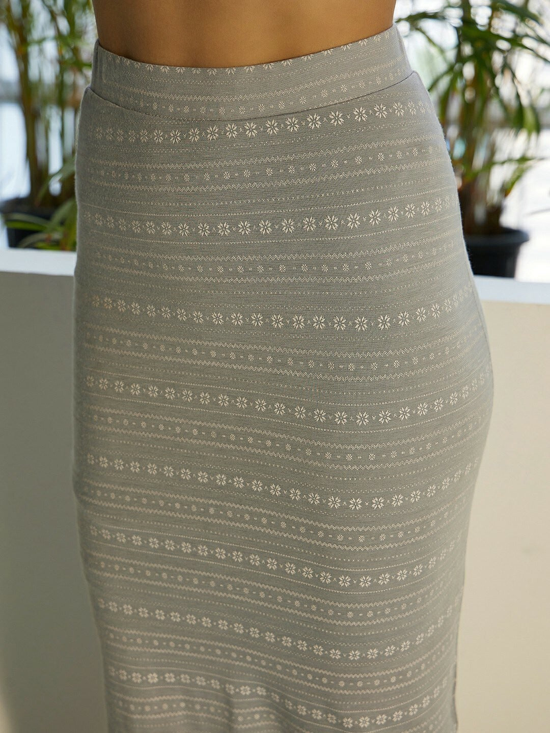 Berrylush Women Grey & White Ethnic Printed Straight Hem Slip-On Knitted Pencil Midi Skirt