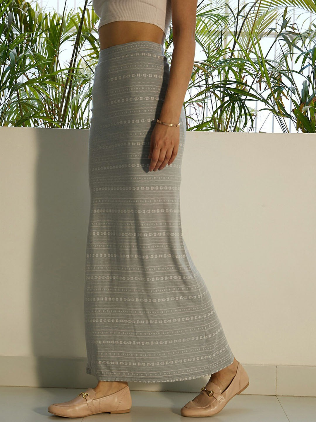 Berrylush Women Grey & White Ethnic Printed Straight Hem Slip-On Thigh-High Slit Knitted Pencil Maxi Skirt