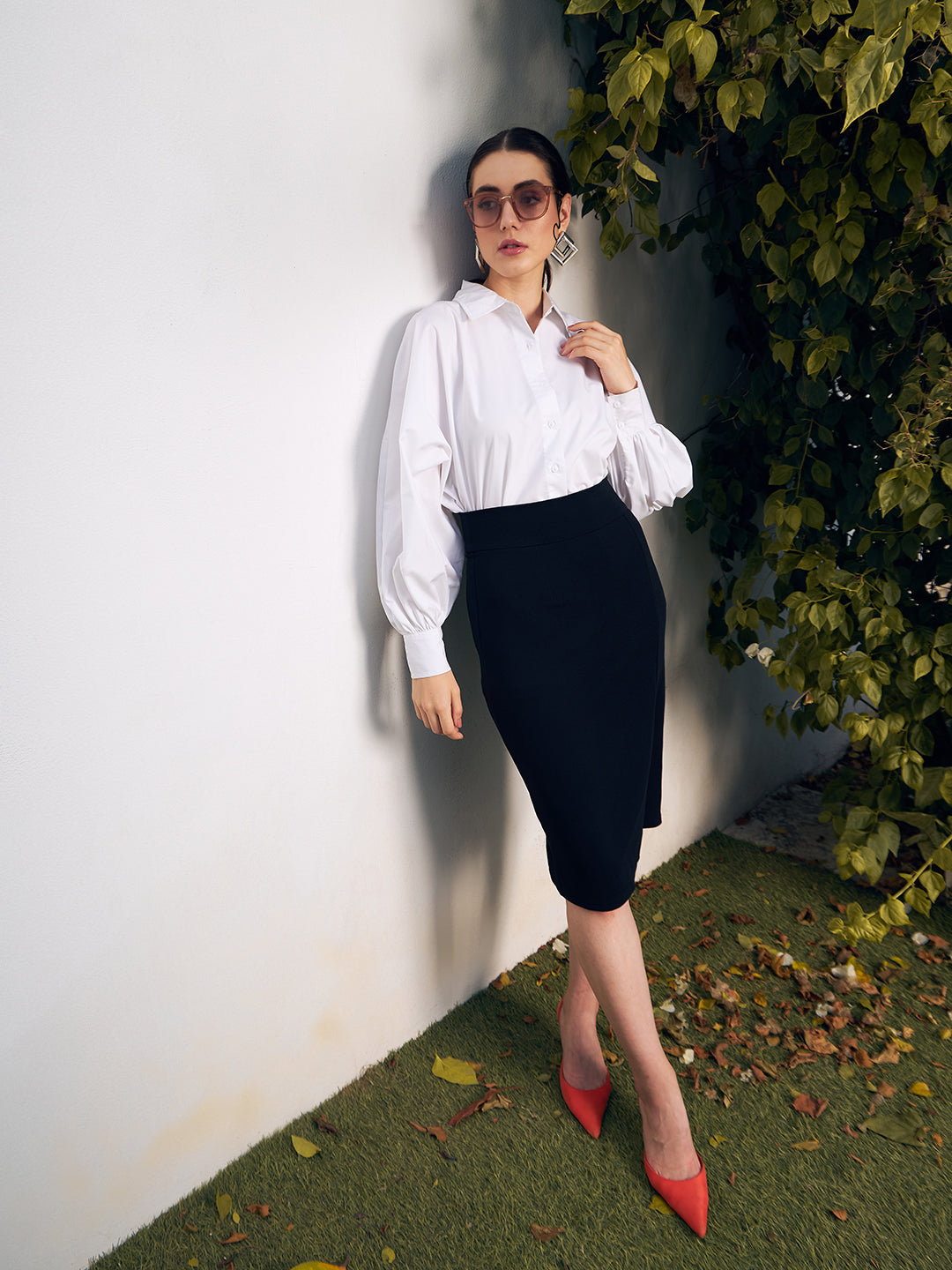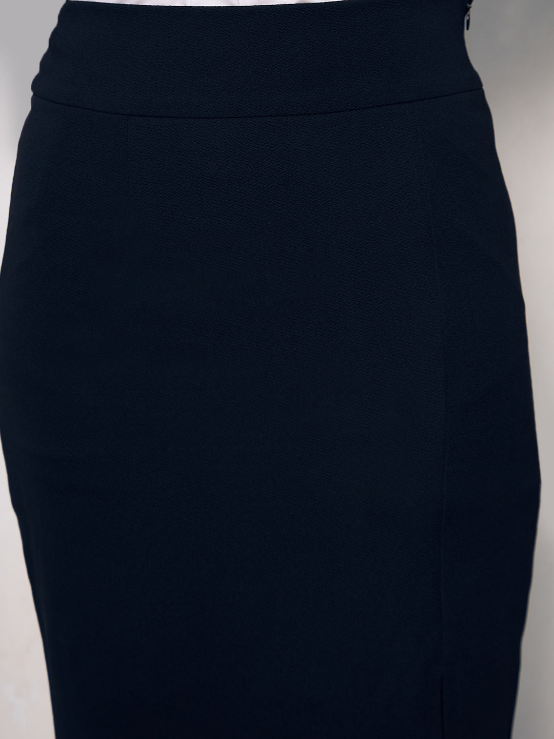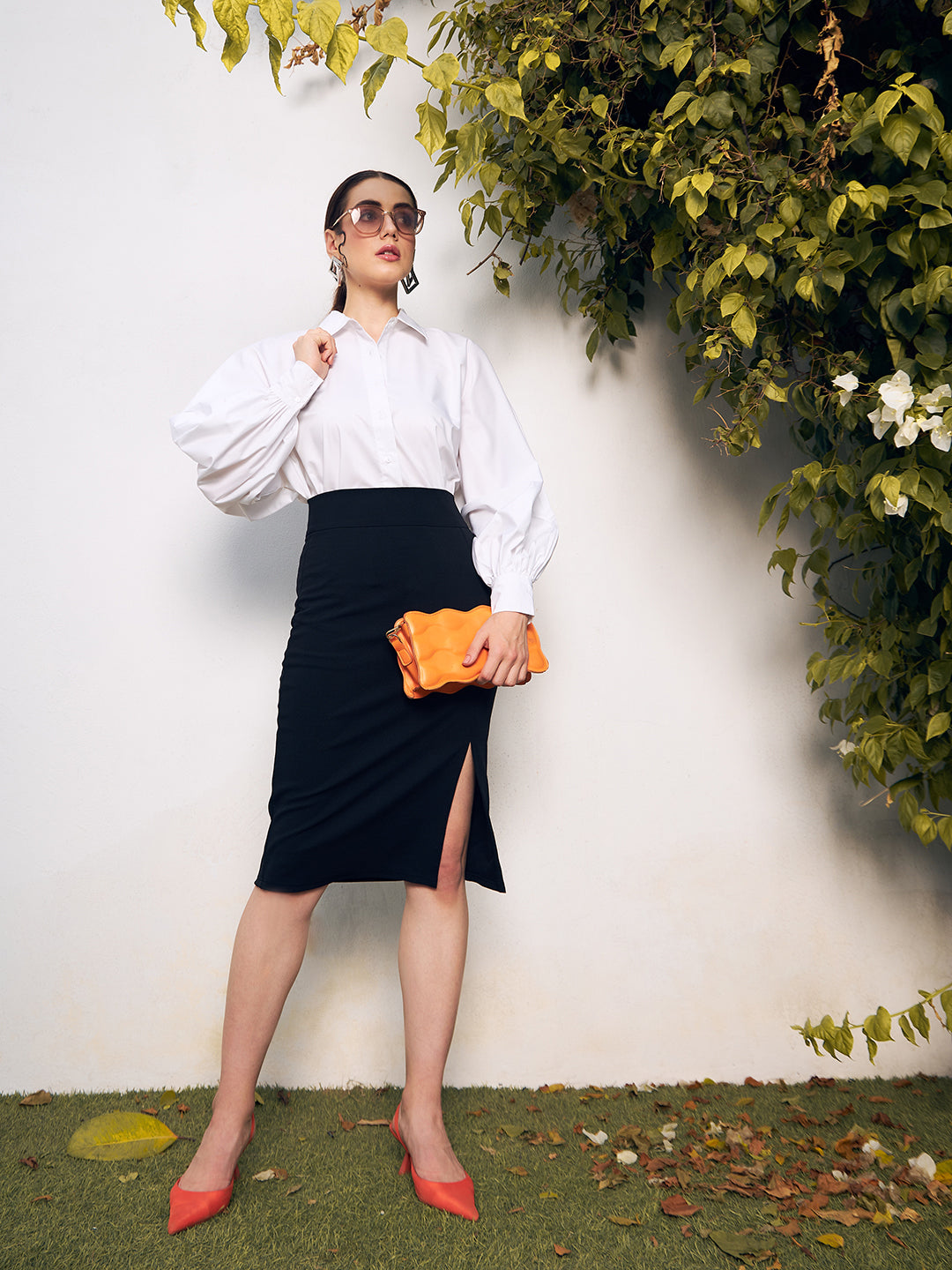 Berrylush Women Solid Black High-Rise Elastic Waist Crepe Thigh-High Slit Straight Hem Pencil Midi Skirt