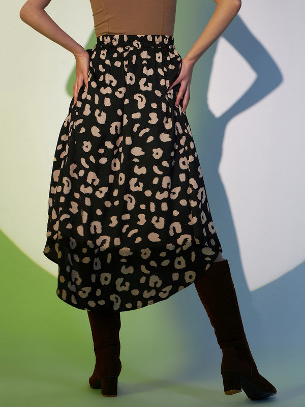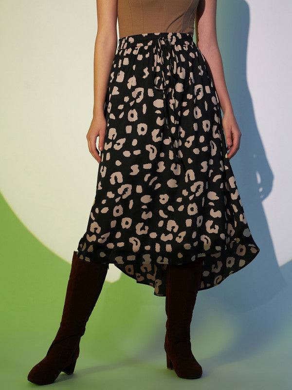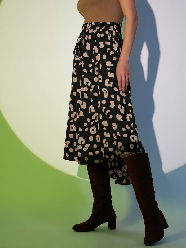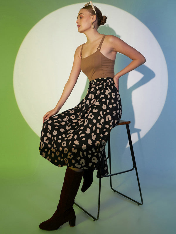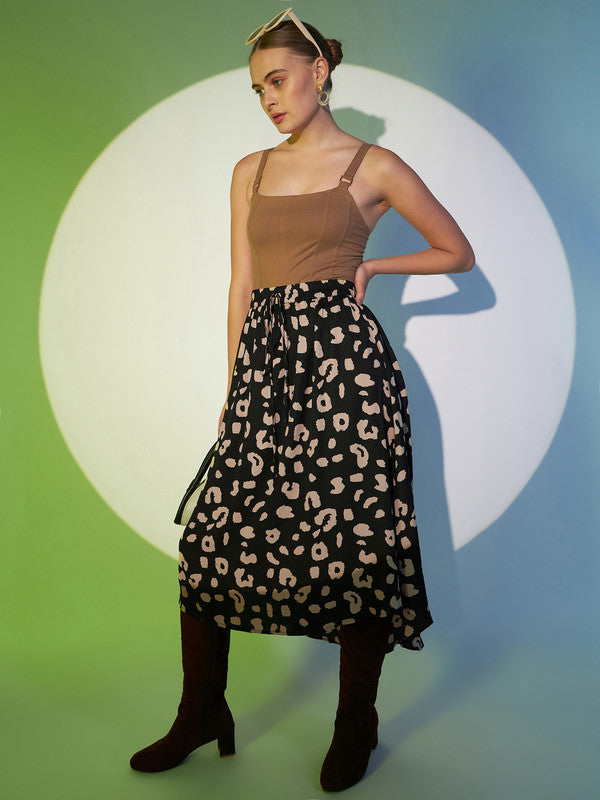 Berrylush Women Black & Beige Animal Printed High-Rise Elastic Waist Tie-Up Flared A-Line Mini Skirt