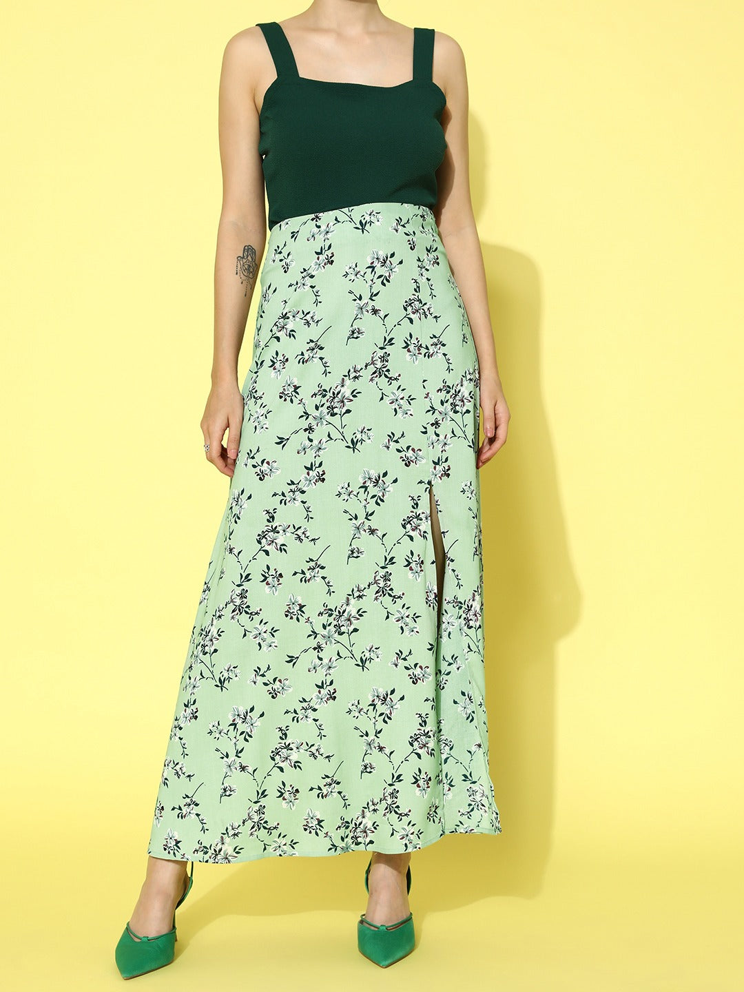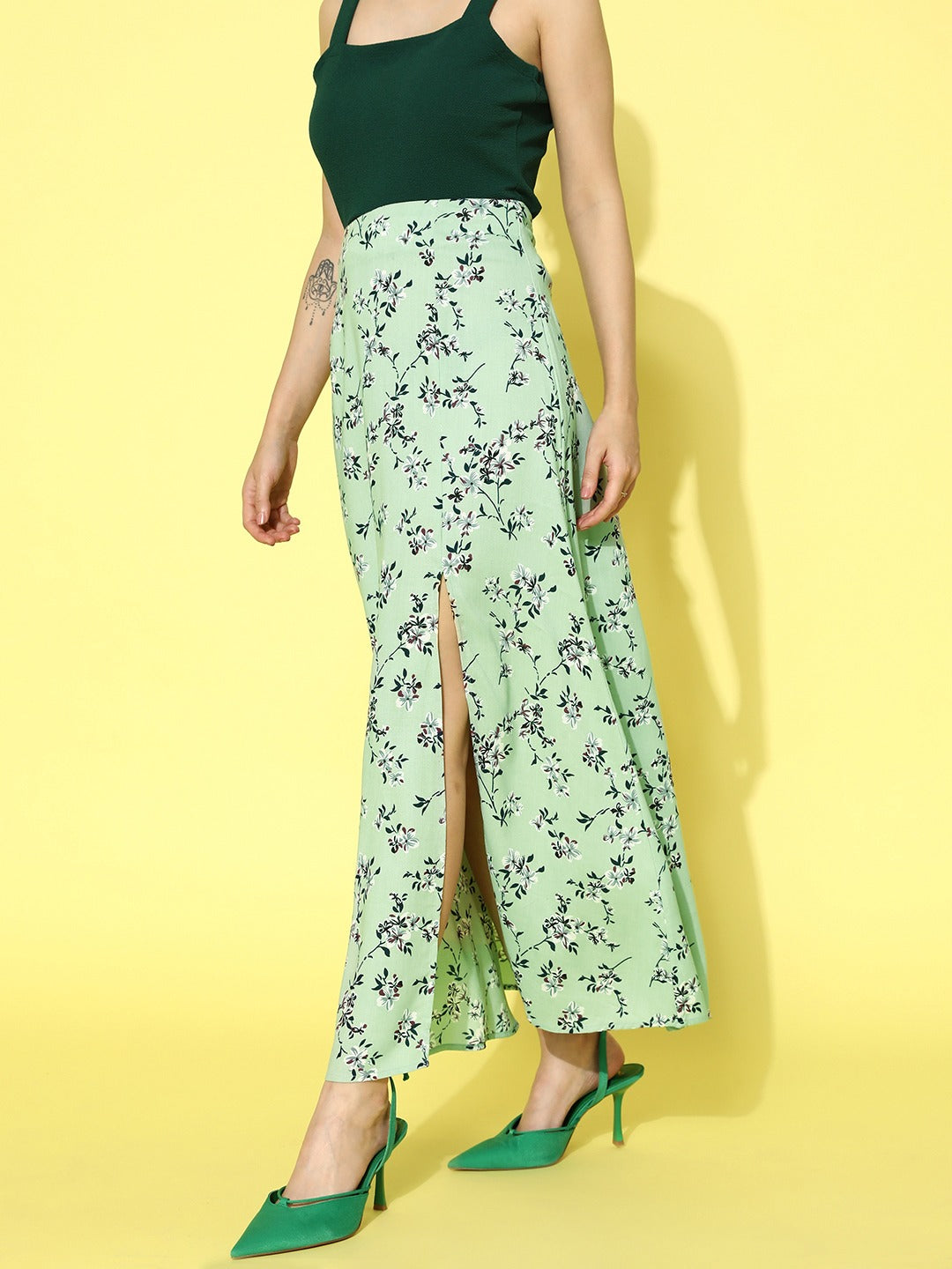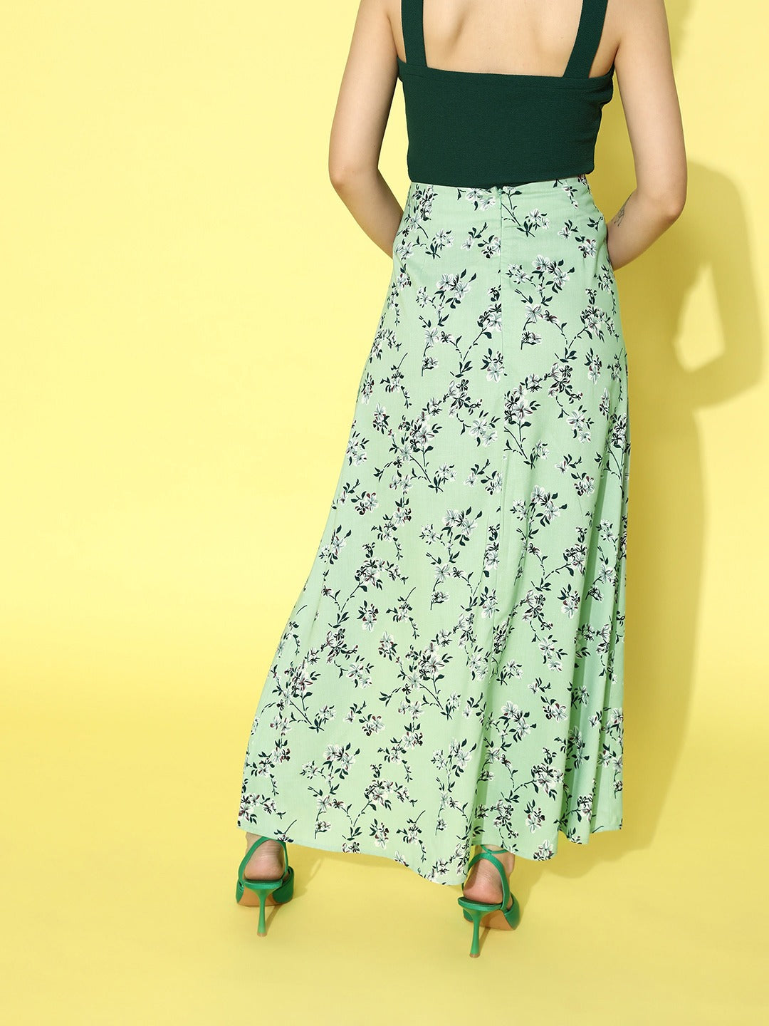 Berrylush Women Green & White Floral Printed High-Rise Side-Slit Flared A-Line Maxi Skirt