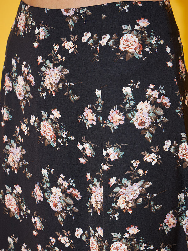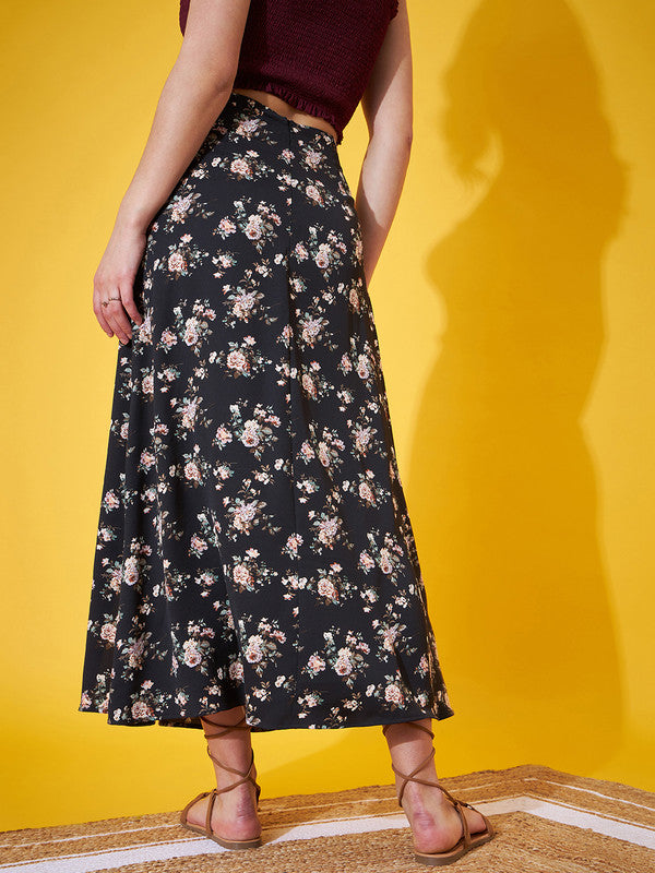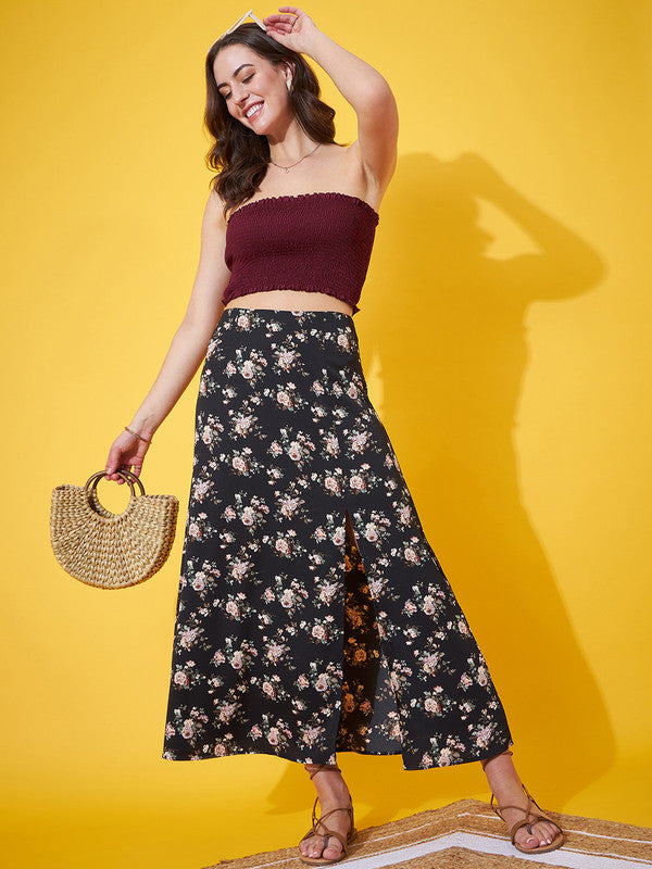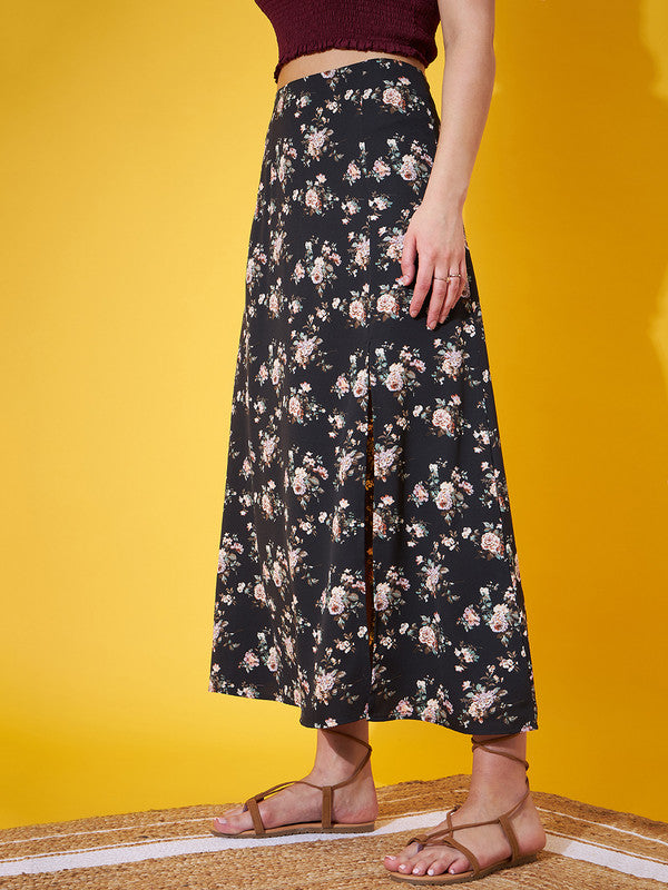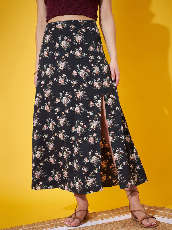 Berrylush Women Black & Pink Floral Printed High-Rise Waist Straight Hem Thigh-High Slit A-Line Maxi Skirt