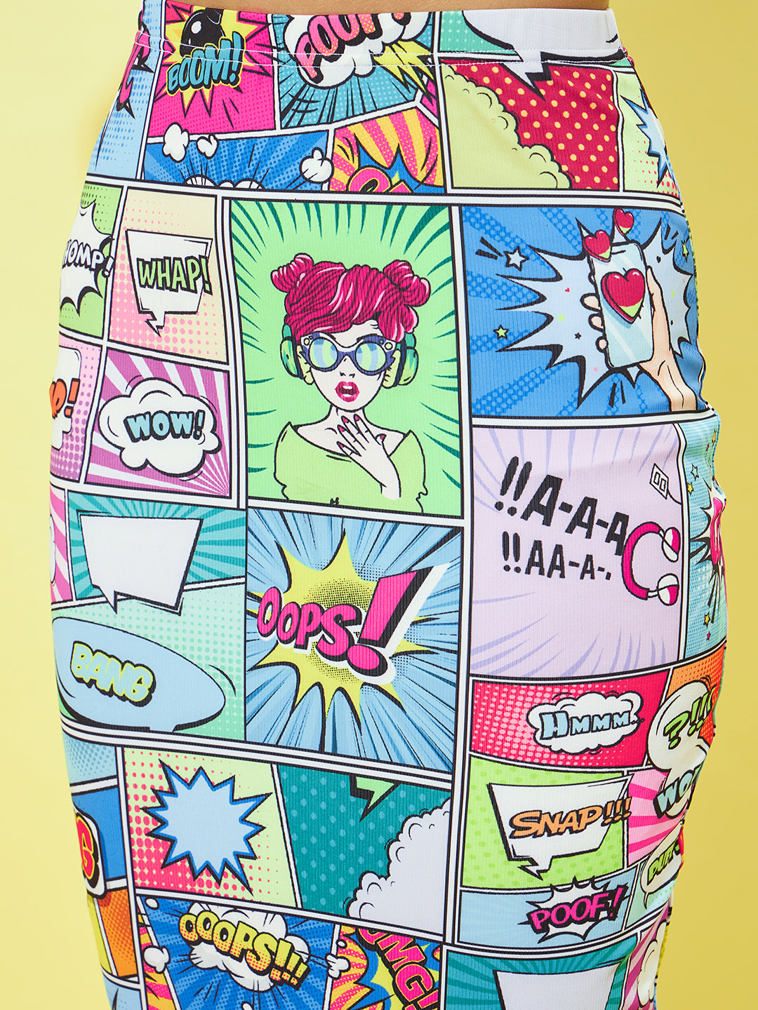 Step into a vibrant world with the Berrylush Multicolour Graphic Printed Midi Skirt. Crafted from cosy polyester with a knitted weave, this pencil skirt boasts a high-rise waist and an effortless slip-on design for both comfort and style. Its eye-catching graphic print exudes artistic flair, perfect for any smart casual occasion. The straight hem paired with an elegant back-slit detail enhances mobility while adding a hint of allure to your ensemble. Opaque in nature, it aligns perfectly with your need for both fashion and modesty, making every turn graceful yet bold.