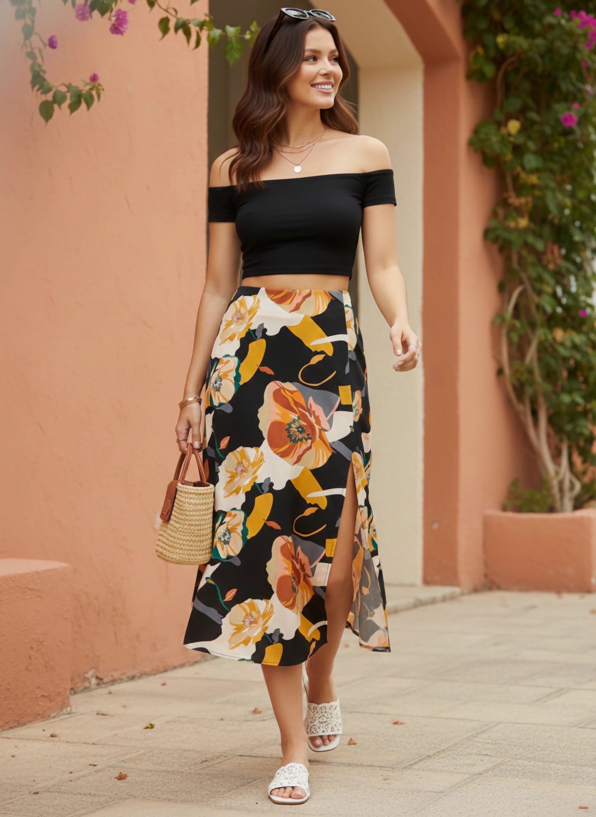 Step out in style with the Berrylush Black & Orange Floral Printed A-line Midi Skirt, a mesmerizing blend of black and orange floral prints that promises to upgrade your casual wardrobe. Crafted from high-quality polyester crepe, this skirt offers both comfort and durability while maintaining an elegant flow with its flared hemline. The thigh-high slit adds a touch of allure, allowing you to move freely and confidently throughout your day. Designed for versatility, it features a discreet zipper closure that ensures a seamless fit. Whether you're headed to brunch or an afternoon stroll, this midi skirt is the perfect companion for any laid-back occasion.