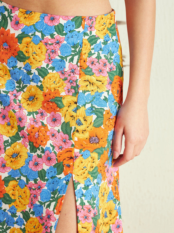 Berrylush Women Multicolour Floral Printed Crepe Thigh-High Slit Flared A-Line Midi Skirt