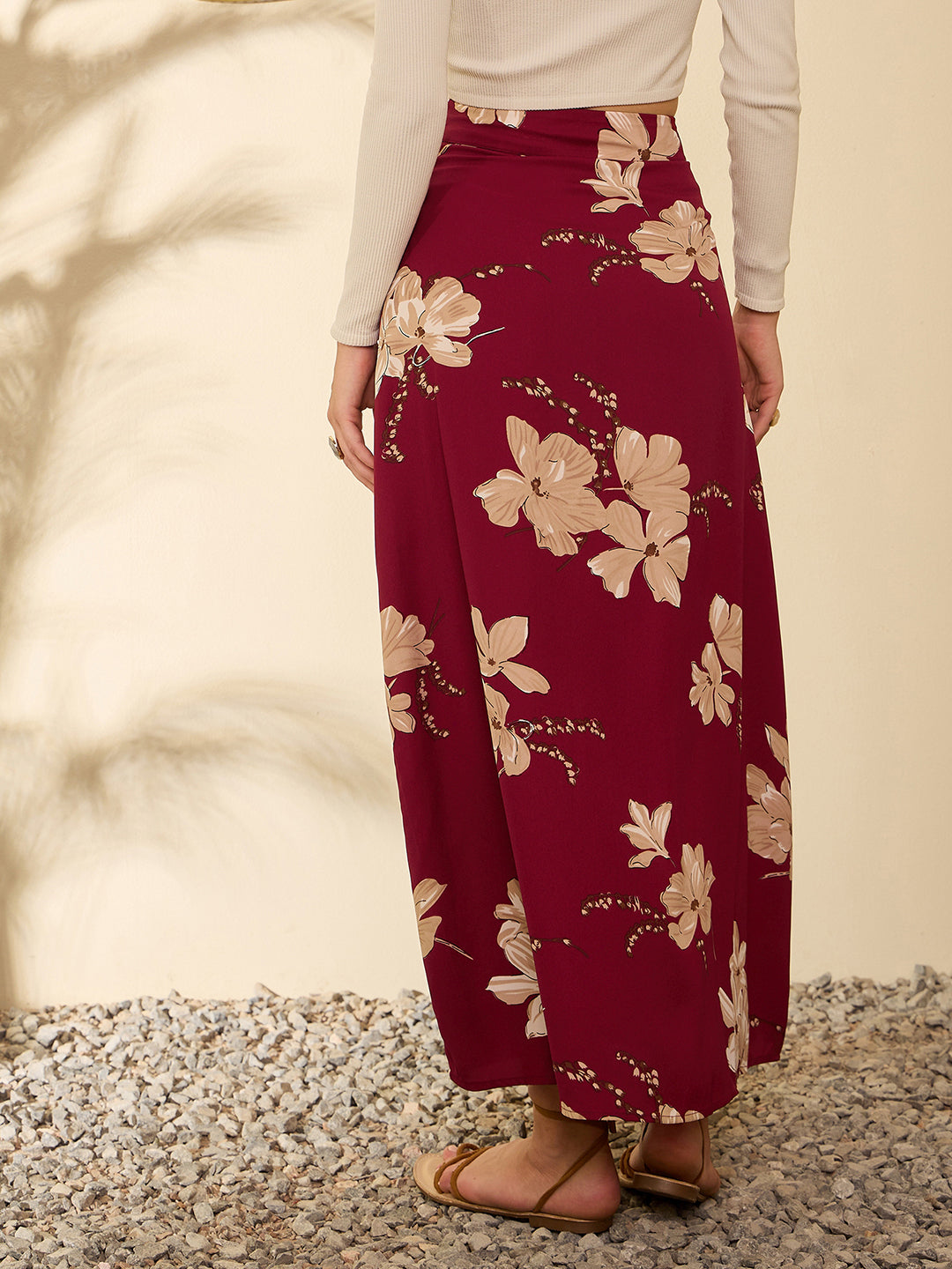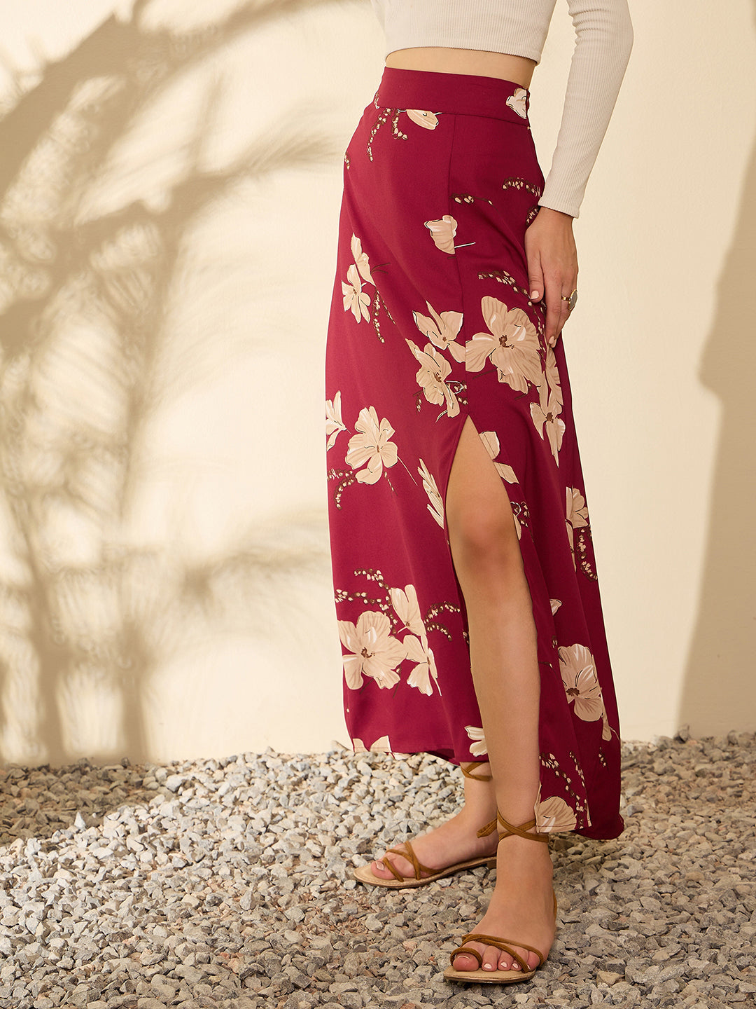 Step into elegance with Berrylush's maxi skirt, perfect for your next travel adventure. This A-line beauty in rich maroon accented with beige floral prints sets the tone for sophisticated wandering. Crafted from smooth polyester and woven to perfection, the skirt ensures a comfortable fit as you explore. It is fashioned with a flattering high-rise waist and features a daring thigh-high slit that adds an edge of allure to your movements. Its straight hemline complements its flowing silhouette while ensuring ease of wear with its neat zipper closure. Opaque yet breathable—this outfit promises picturesque moments on every journey!