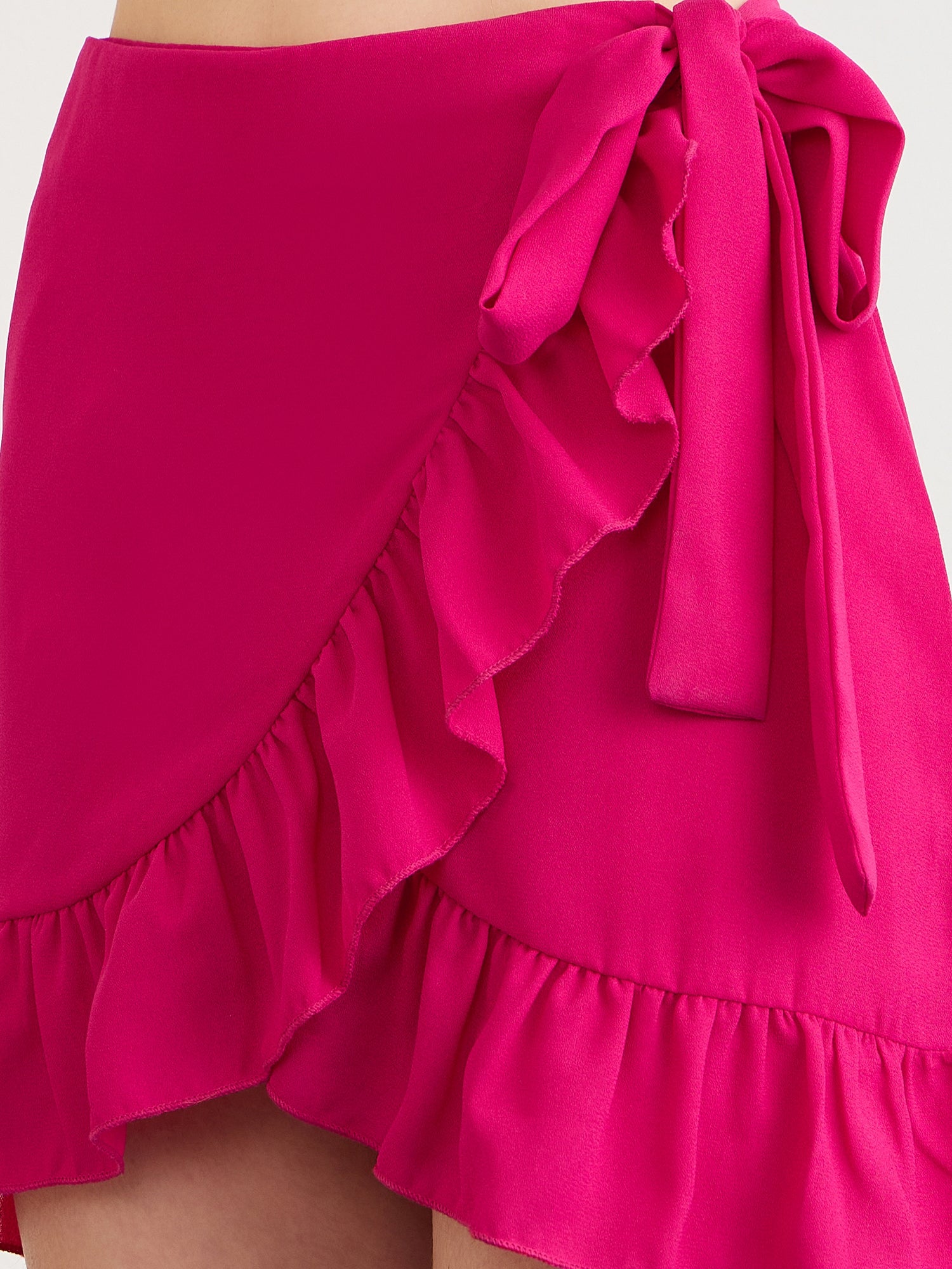 Berrylush Women Solid Pink High-Rise Tie-Up Waist Tulip Hem Wrap Ruffled Mini Skirt