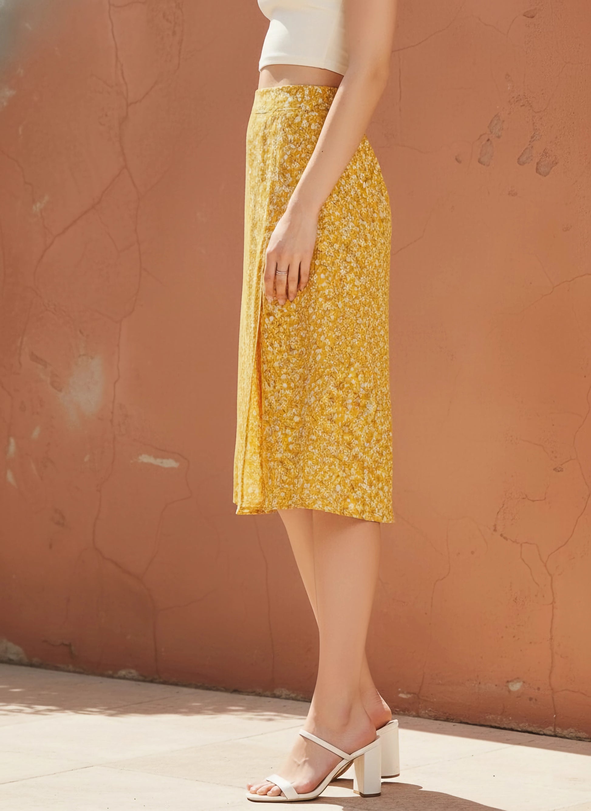 Refresh and restyle your springtime casual closet by adding this dazzling Yellow & White Floral Printed Thigh-High Slit Pencil Midi Skirt from Berrylush. The most adorable part of this skirt is the mesmerizing duo of yellow shade with a white floral print that gives away a cheerful vibe. Designed with a straight hemline that elegantly follows your natural curve and makes this skirt super comfortable to move or sit down. Woven weave adjoins excellent structural integrity and flexibility to this skirt. Match this sizzling slit midi skirt with a Bardot top, a pair of pump heels, and a trendy handbag to create a boho-chic look.
