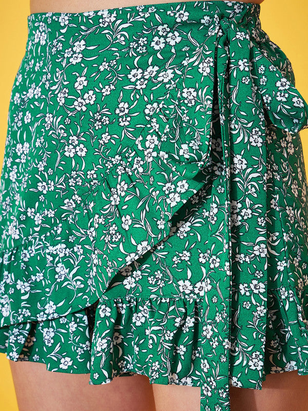 Berrylush Women Green & White Floral Printed High-Rise Tie-Up Waist Tulip Hem Wrap Ruffled Mini Shorts