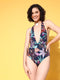 Berrylush Women Lavender & White Abstract Printed Halter Neck Tie-up Criss-Cross Back Swimsuit