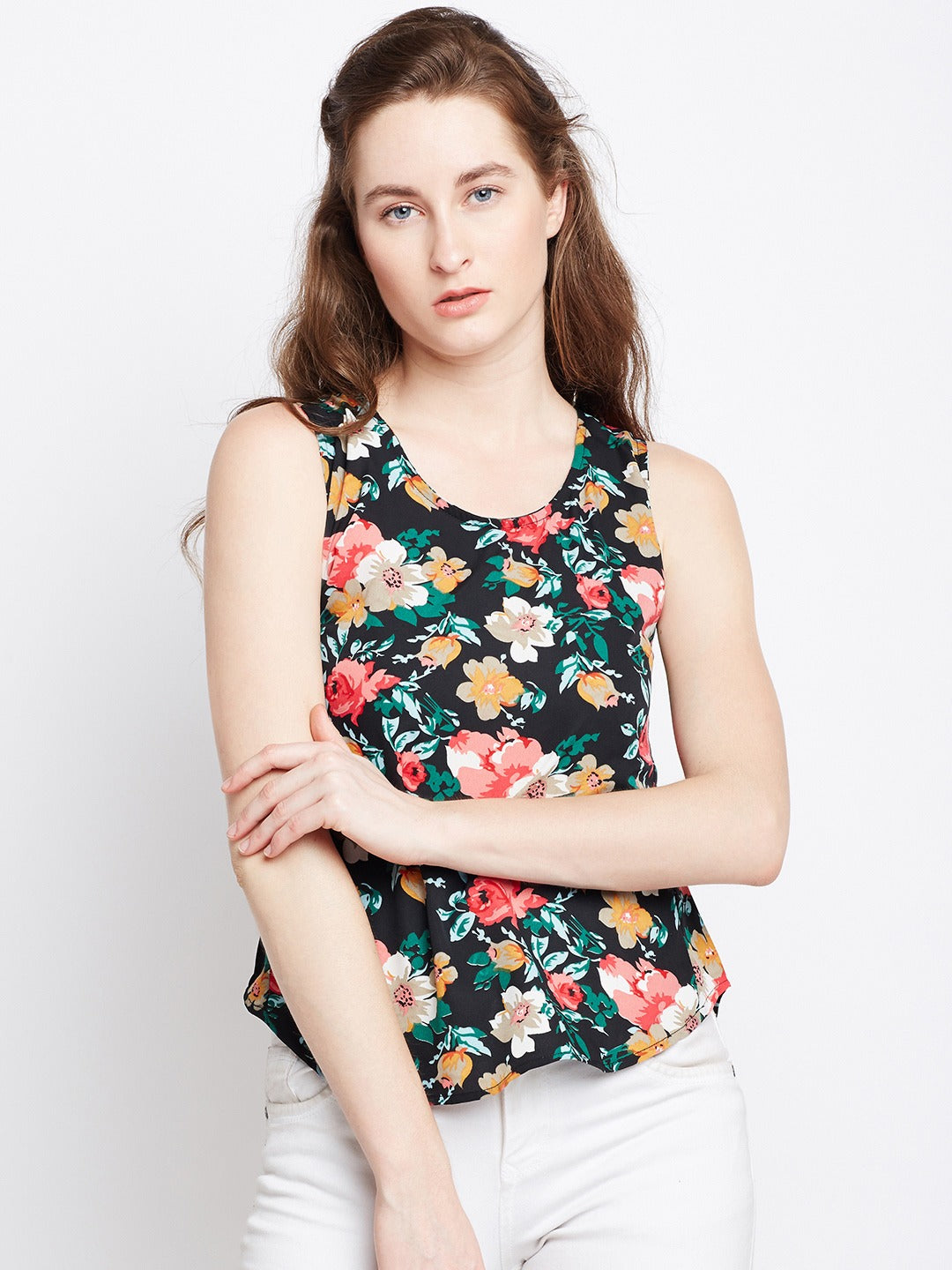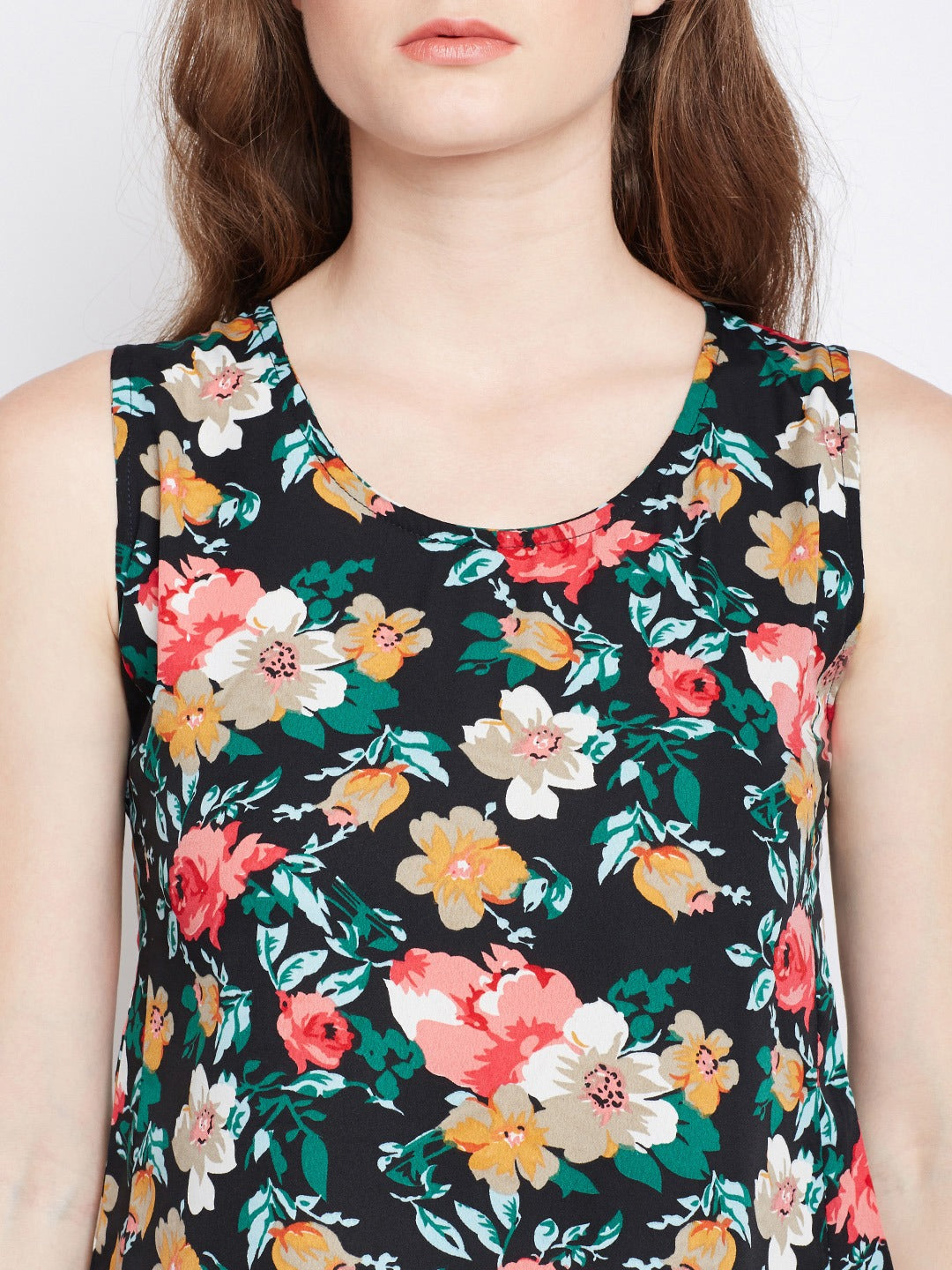 It’s time to create your own personal style with bold prints just like this enchanting Black Floral Printed Round Neck Sleeveless Regular Top from that exclusive print and pattern collection of Berrylush. Decked with a round neck design that adds effortless sophistication to this top with an enticing appeal to your neckline. Decorated with a multicolour floral print that gives this top a majestic and eye-catching design with the essence of nature’s beauty. Fashioned with a regular length that lends this top a modest style statement and offers complete and striking coverage to your upper body. Pair up this top with your favourite jeans, pump heels, tassel floral earrings, and a trendy sling bag to get a chic look for attending dinner with friends and family.