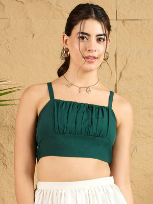 Berrylush Women Solid Green Square Neck Sleeveless Smocked Back Pleated Crop Top