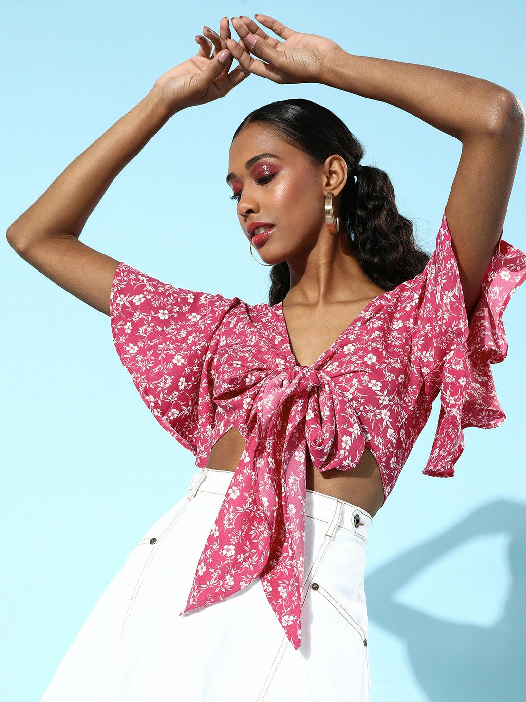Looking for an elegant option without compromising on the wearability factor then this gorgeous Pink & White Floral Printed V-Neck Tie-Up Front Blouson Crop Top designed by Berrylush is especially meant for you. Covered in the pink floral pattern that gives off a cheerful and tropical vibe while the front tie-up styling adds eccentric glamour to this top. Prepared from crepe polyester fabric that makes this top lightweight along with sweat-wicking properties. Also, the short-flared sleeves adjoin a flattering texture to this top with proper ventilation of your arms. Enjoy your day out with your friends looking stunning by wearing this fabulous crop top with your favourite pair of jeans, pump heels, and a cute side bag.