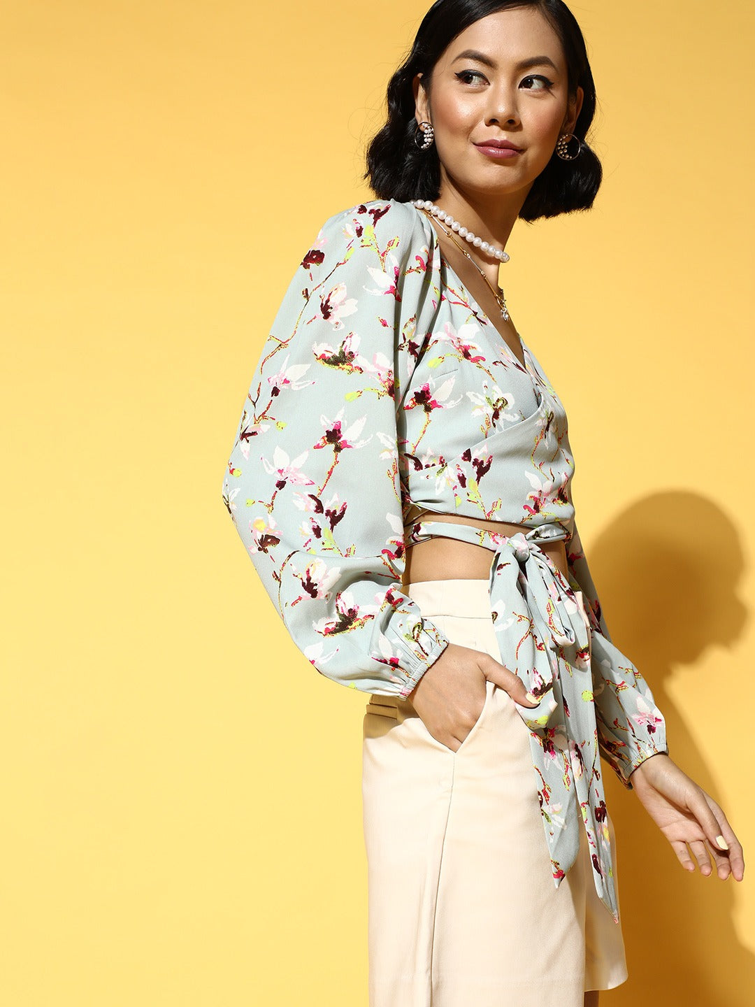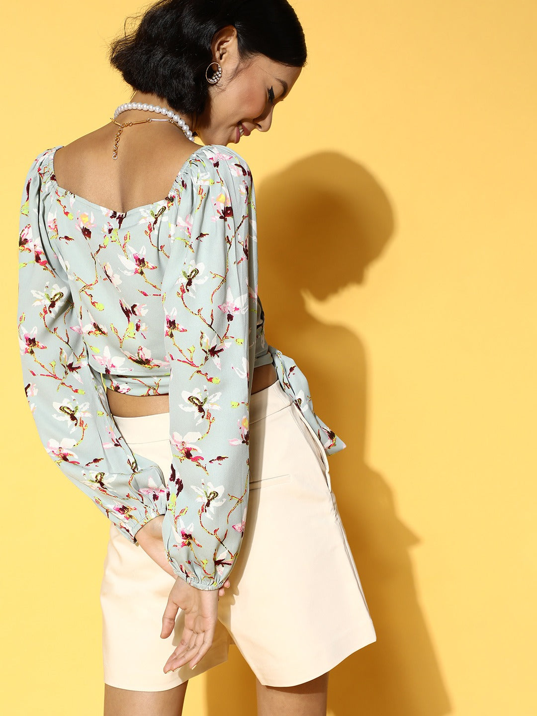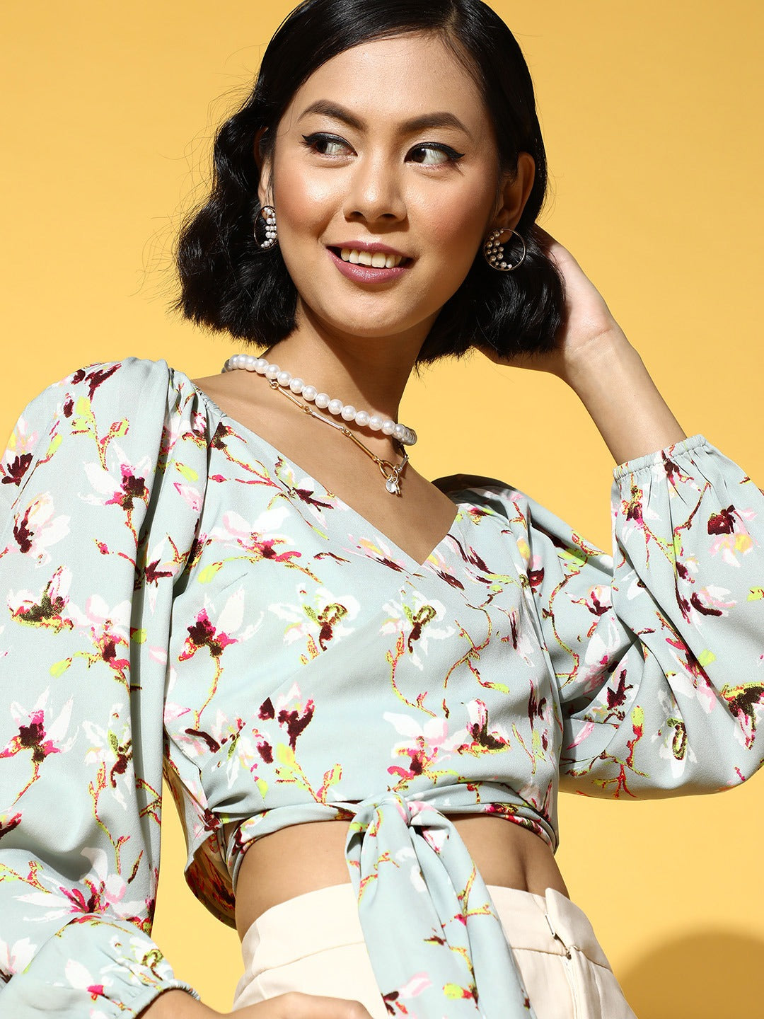 Berrylush Women Mint Green Floral Printed Puff Sleeves Fitted Crop Top