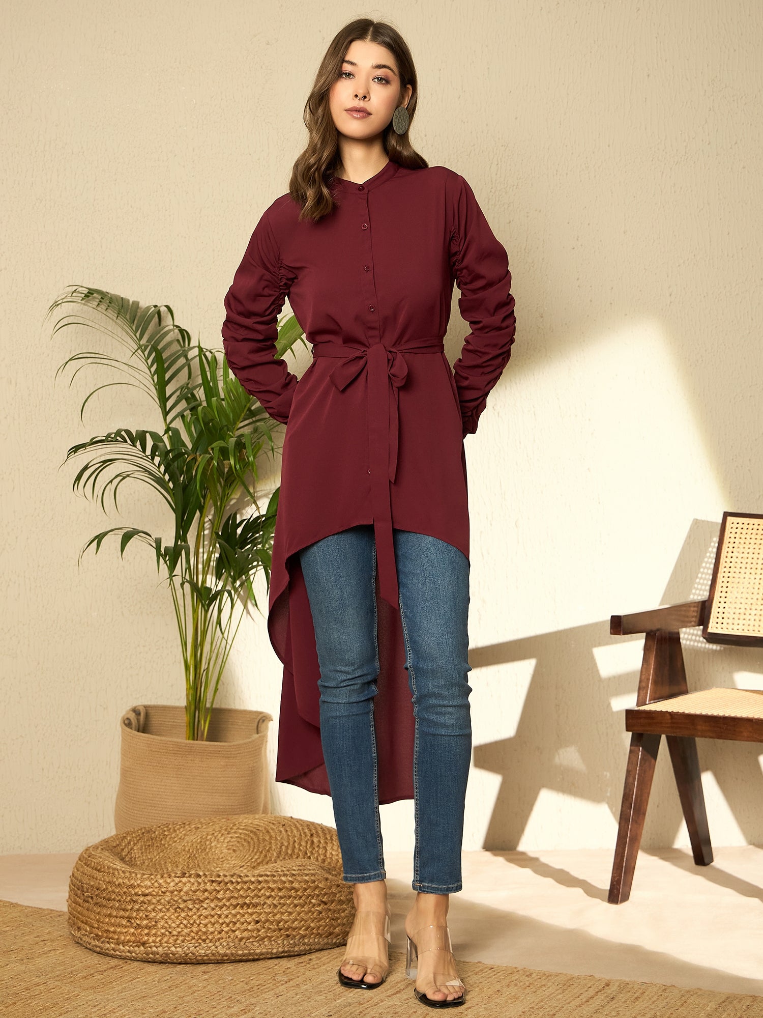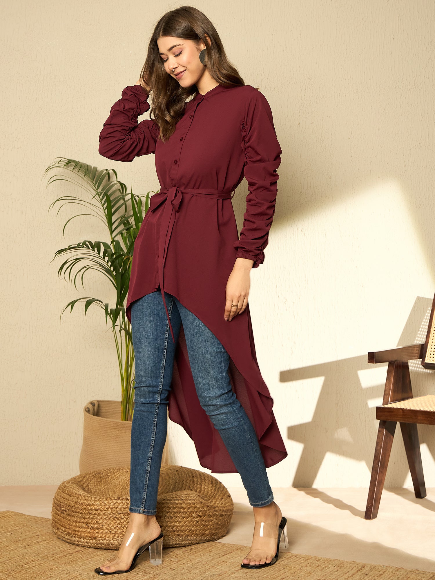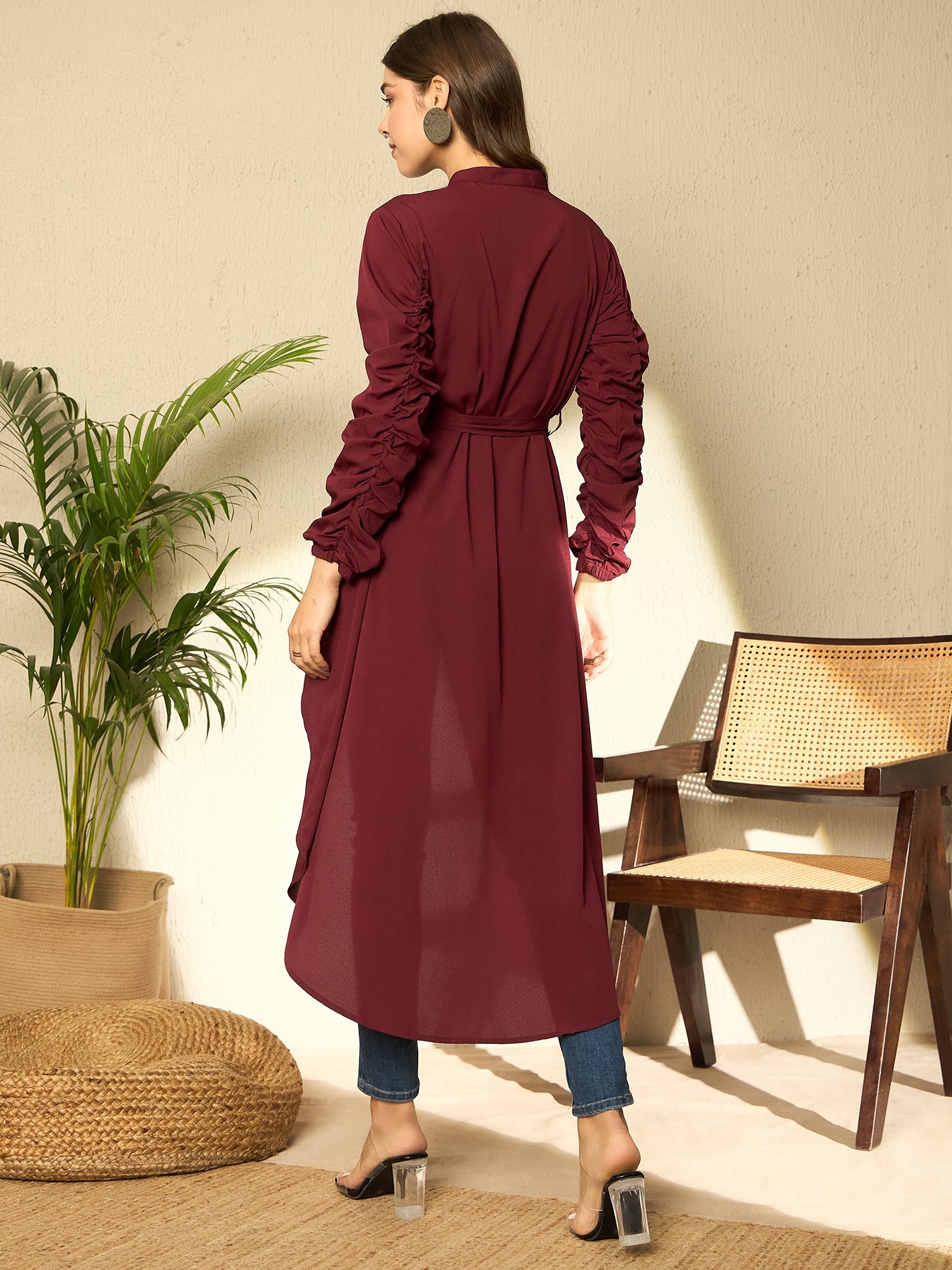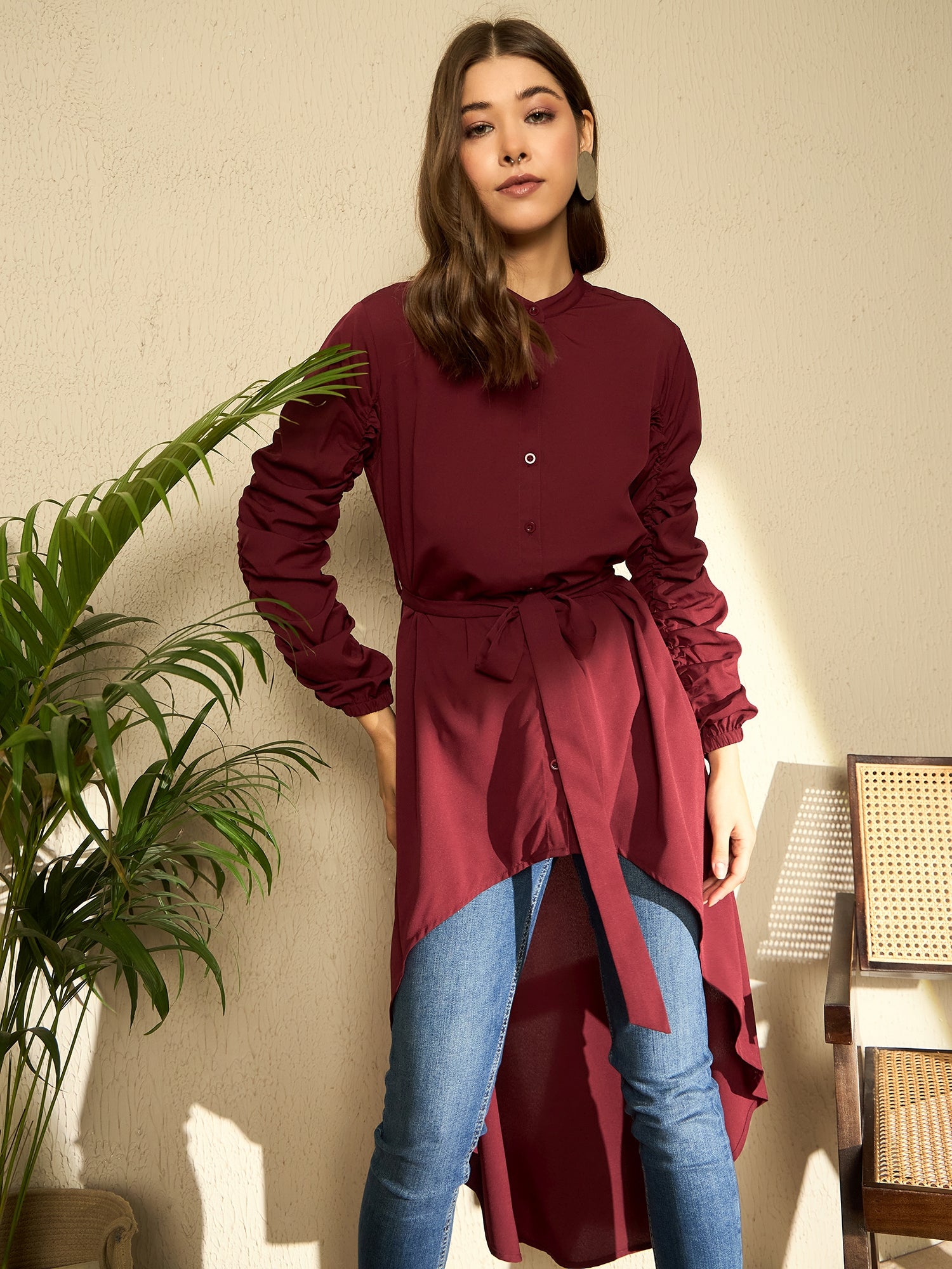 Berrylush Women Solid Maroon Stand Collar Neck Bishop Sleeves Tie-Up Waist Front Button-Up High-Low Hem Pleated Longline Top