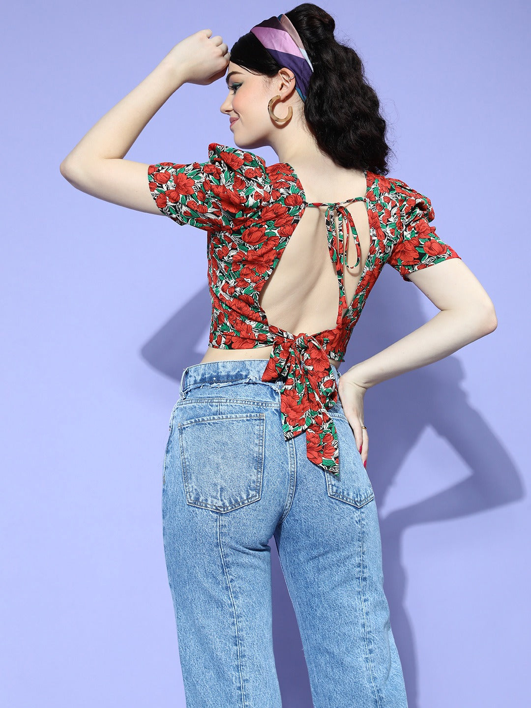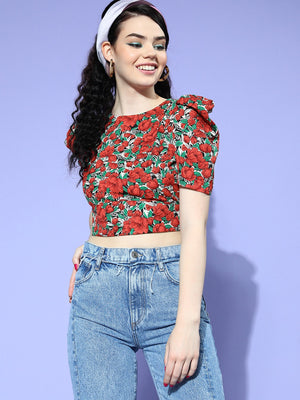 Berrylush Women Red & Green Floral Printed Round Neck Tie-Up Back Crepe Fitted Crop Top