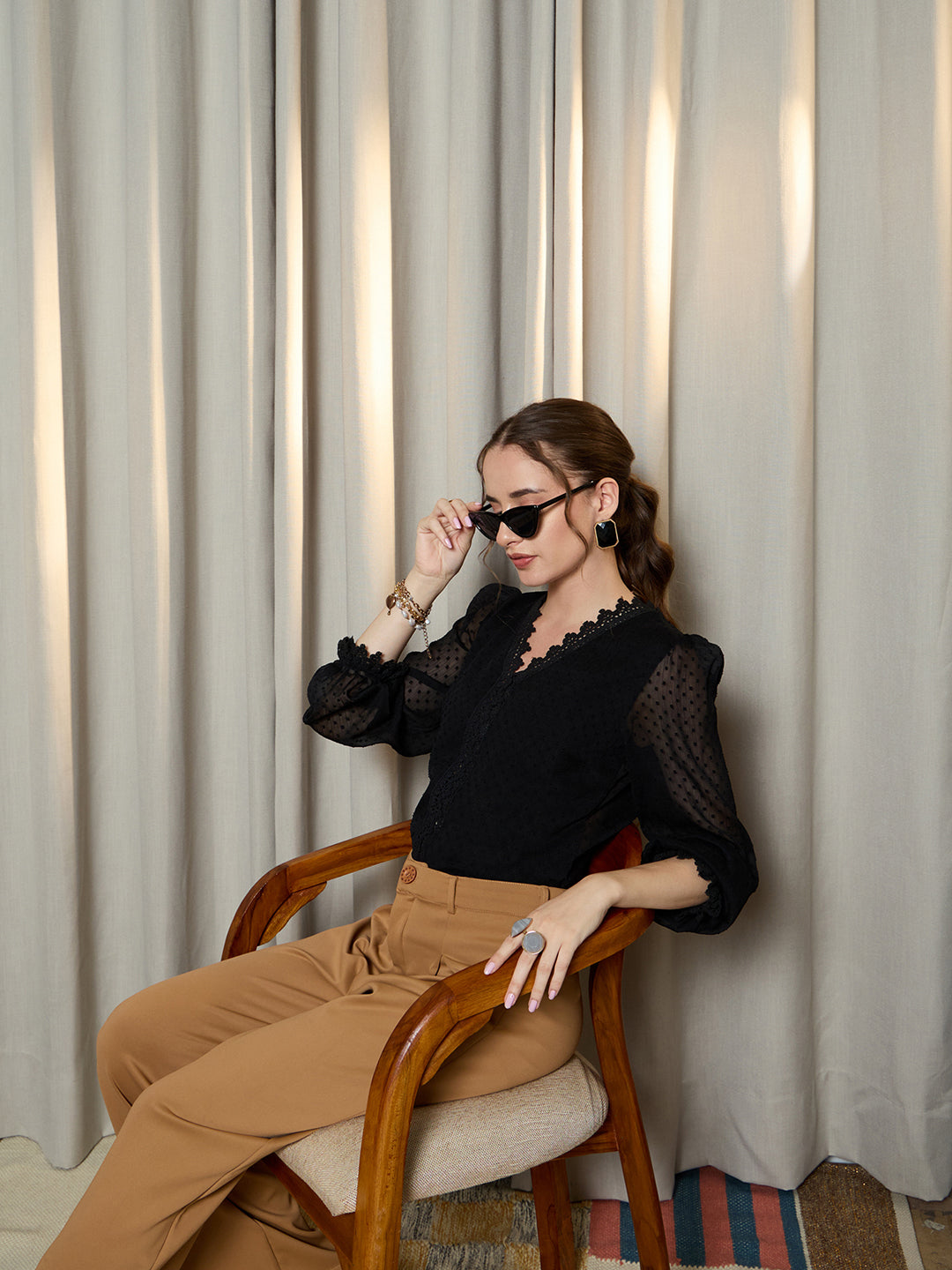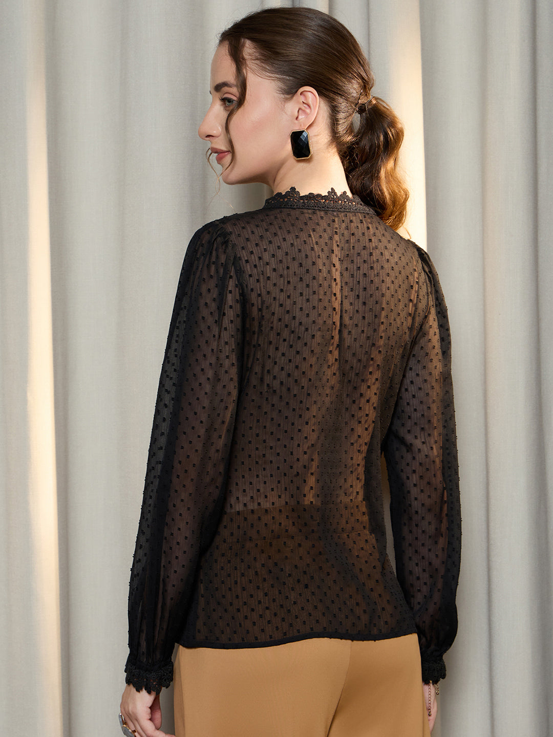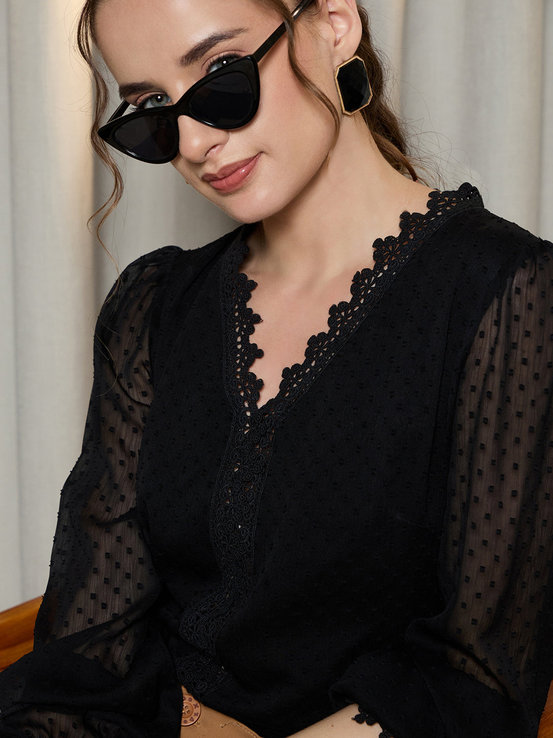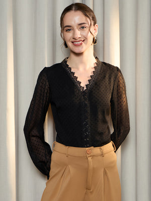 Berrylush Women Solid Black Dobby Weave V-Neck Bishop Sleeves Front Lace Button-Up Regular Top