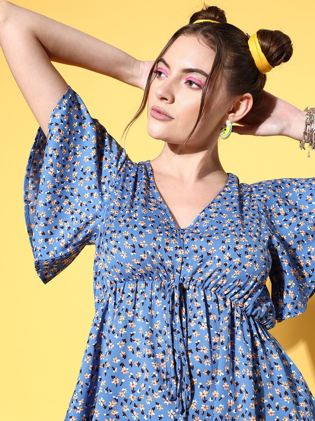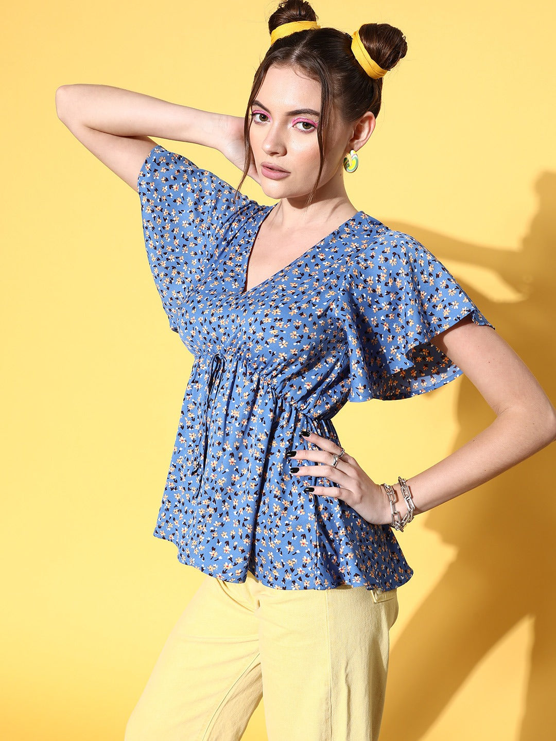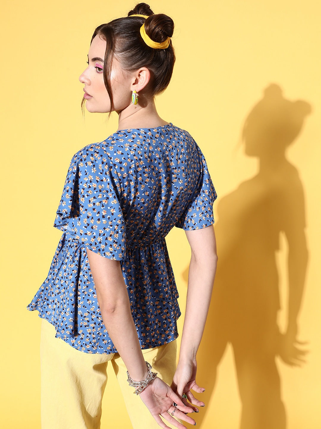 Berrylush Women Blue & White Floral Printed V-Neck Tie-Up Front Crepe Regular Peplum Top