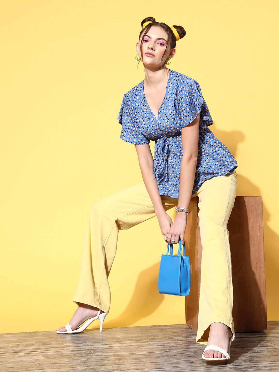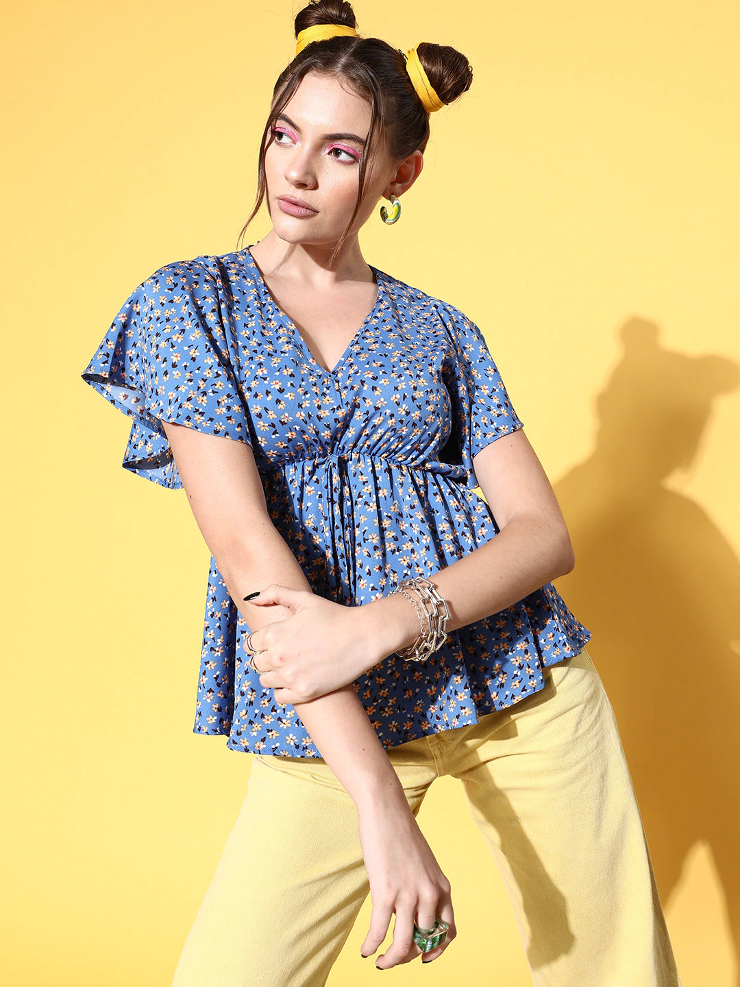 Get your summer closet a crisp addition with a breezy silhouette by investing in this chic Blue Floral Print Crepe Peplum Regular Top from Berrylush. Infused with a captivating amalgam of blue and white floral print that gives this top a vibrant and voguish design. Fashioned with short-flared sleeves that lend this top a loose style note with voluminous coverage to your arms. Moreover, the peplum style elegantly shows off your feminine curves with a trendy casual look. Mix and match this top with your favourite jeans, a pair of white block heels, butterfly earrings, and a blue handbag to create a fashion-flattering appearance.